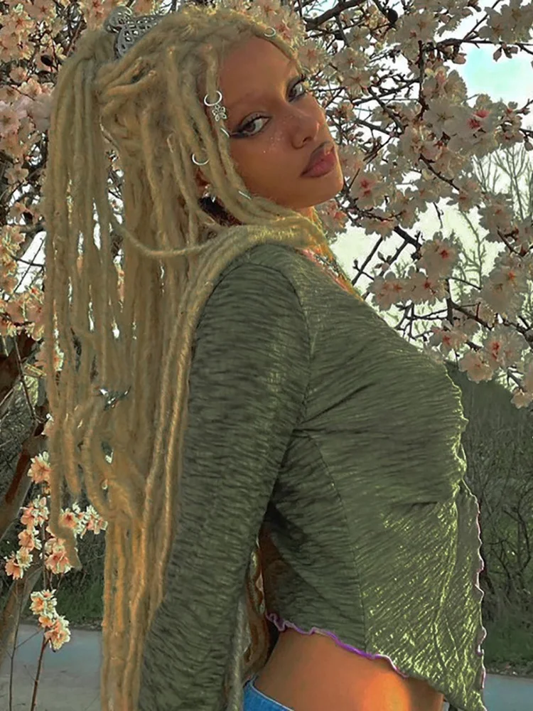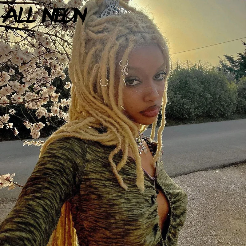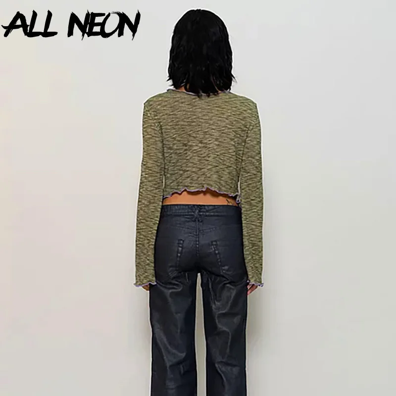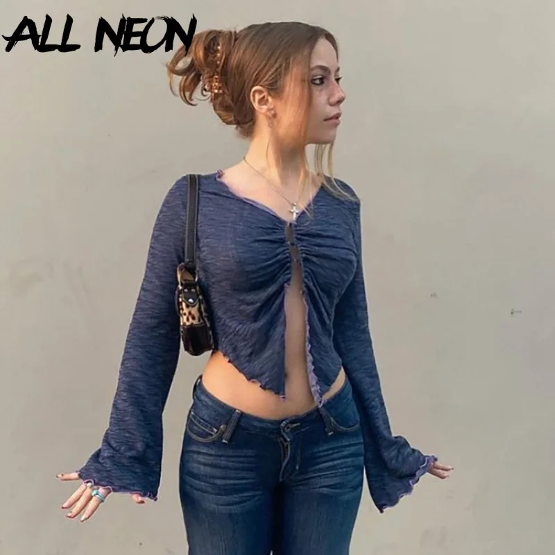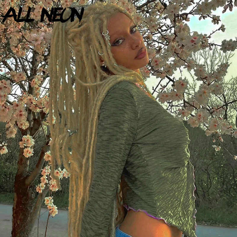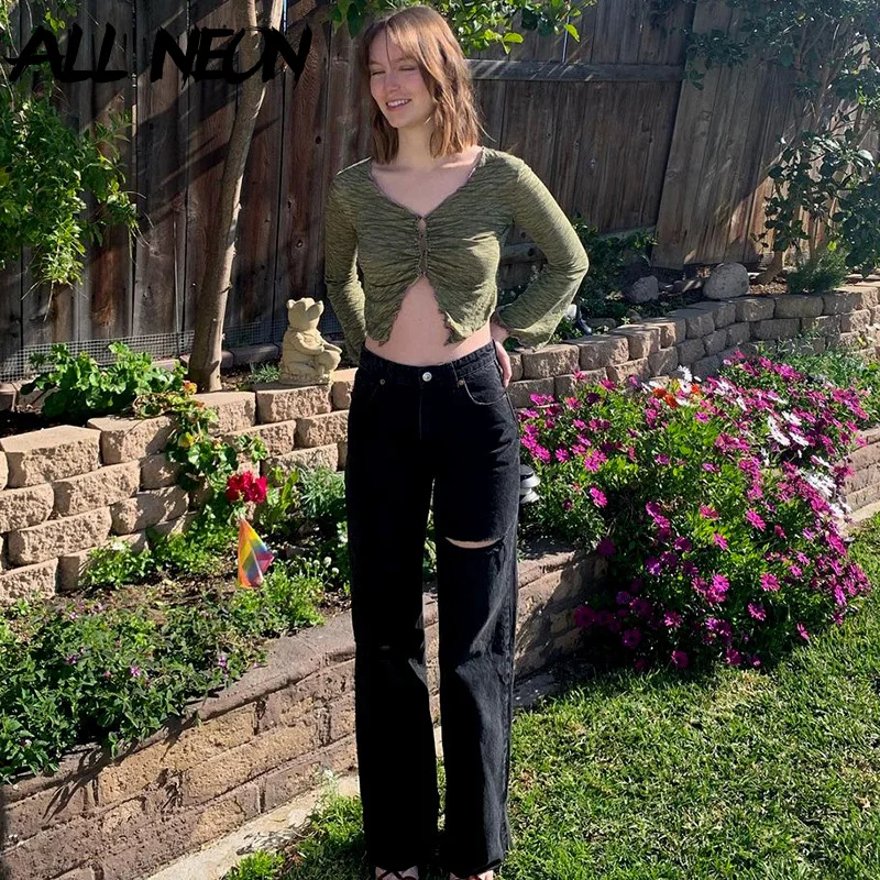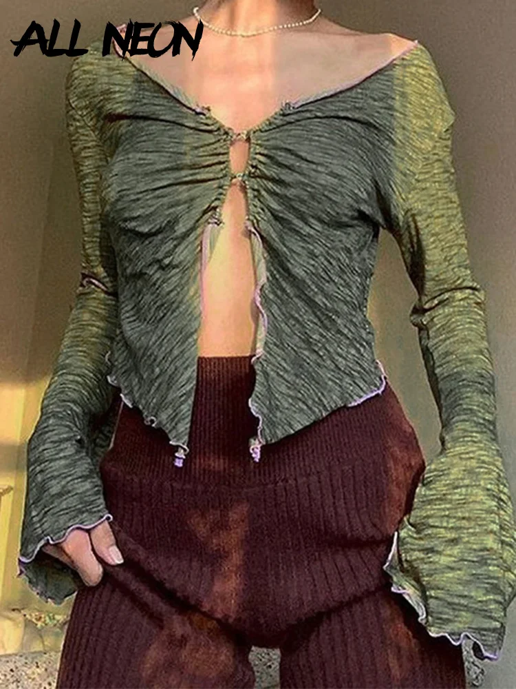 Женская Винтажная Футболка ALLNeon, зеленая футболка на пуговицах, с оборками, V-образным вырезом и Расклешенным рукавом
