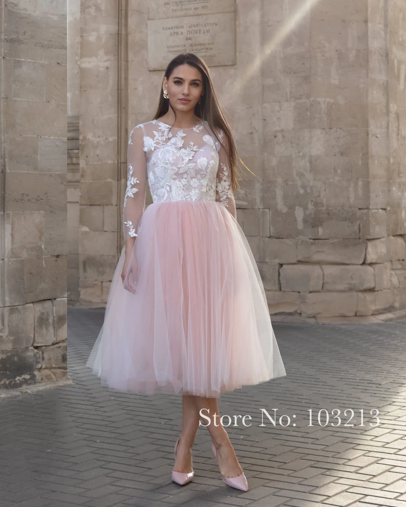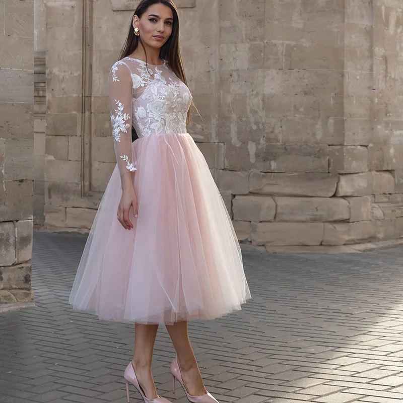 Кружевное Розовое Свадебное платье, ТРАПЕЦИЕВИДНОЕ, Тюлевое, с длинными рукавами, на заказ, 2021