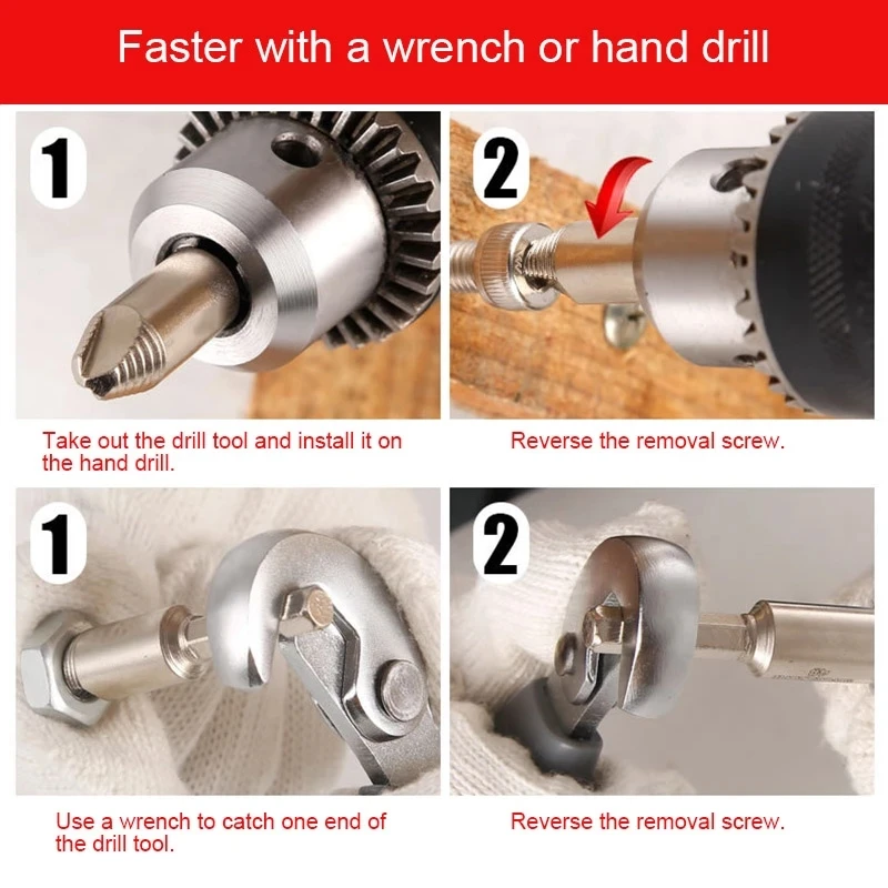 Удобнее, чем двусторонний Съемник винтов. Два простых шага: всего одна электродрель, никаких других инструментов не требуется, замена вверх и вниз не требуется, выберите немного меньше, чем поврежденные винты, чтобы легко снять винты, убедитесь, что бита запущена в обратном направлении во время процесса.