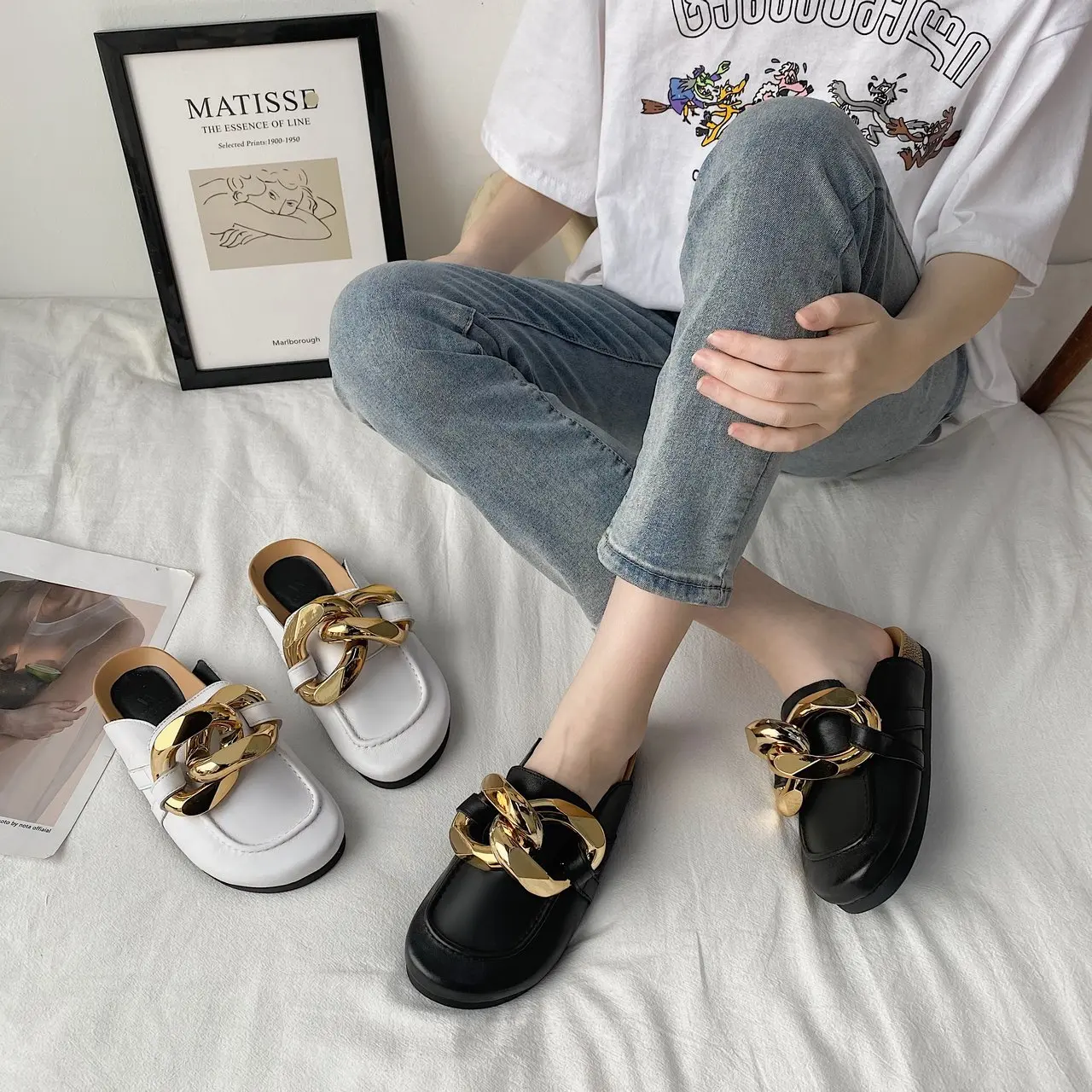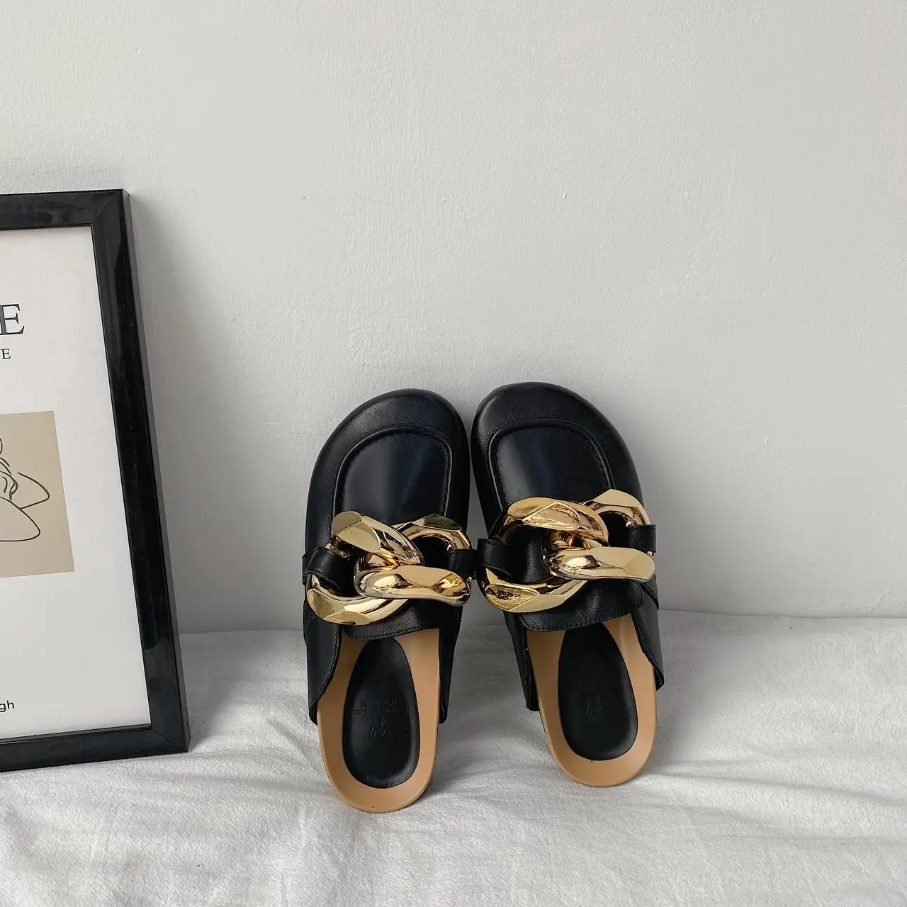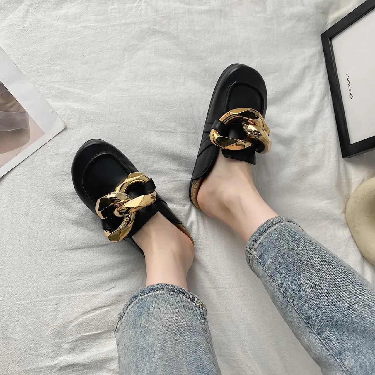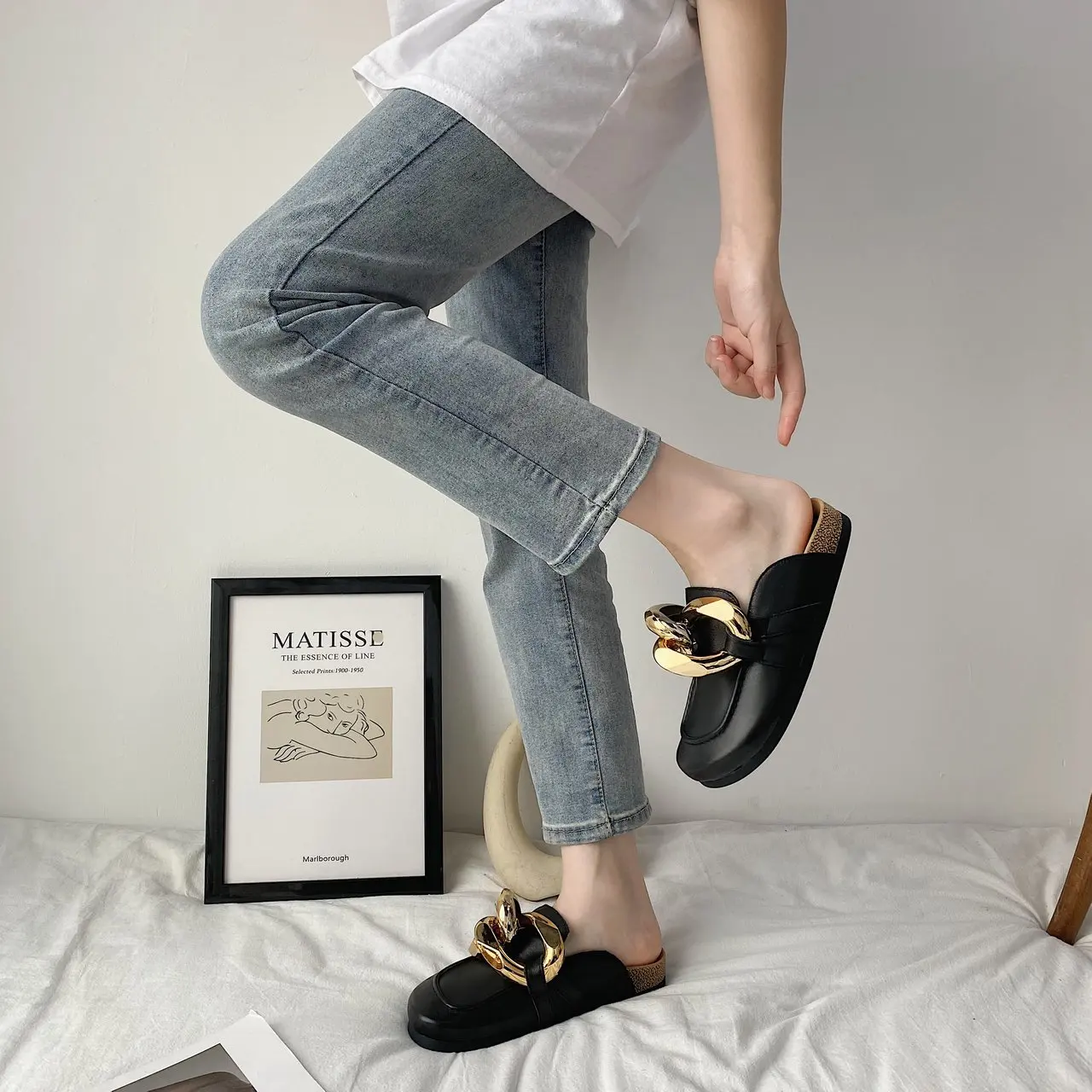 Мюли женские с металлической цепочкой, пляжные шлепанцы на платформе, круглый носок, сланцы, летняя обувь, Прямая поставка
