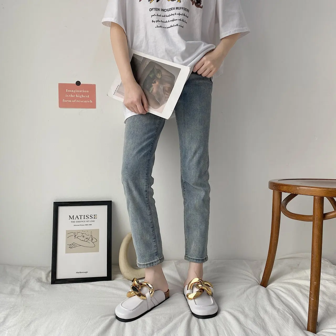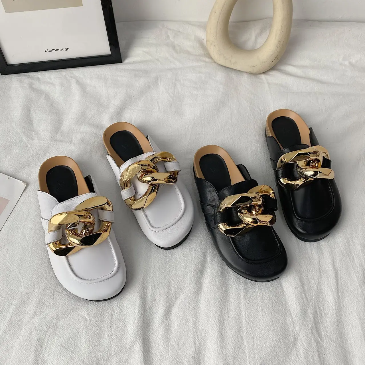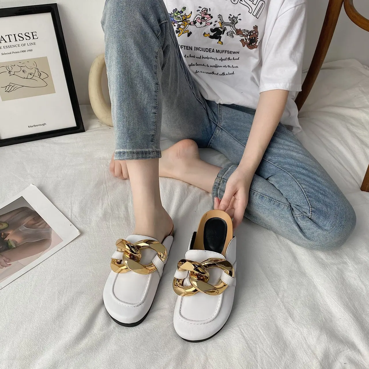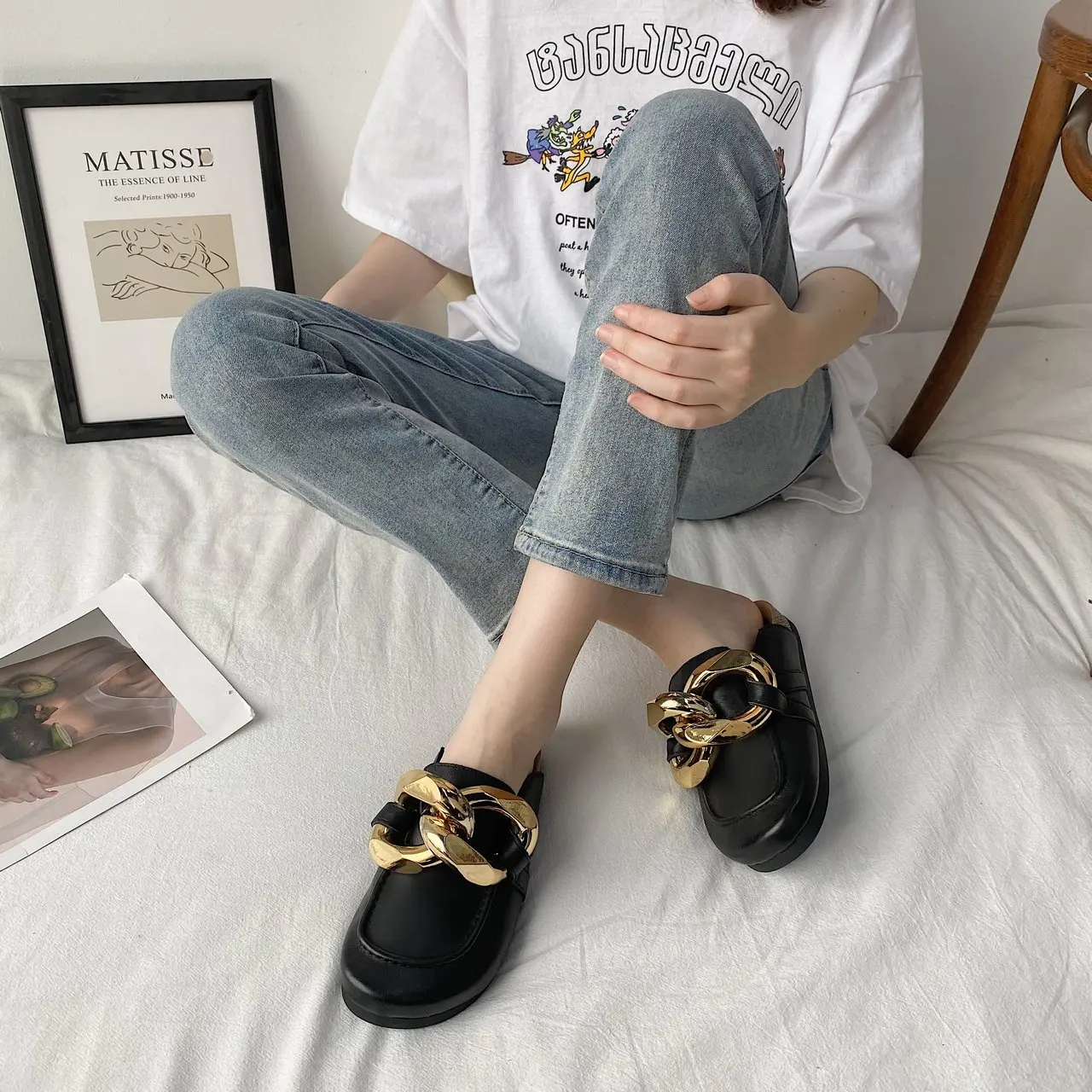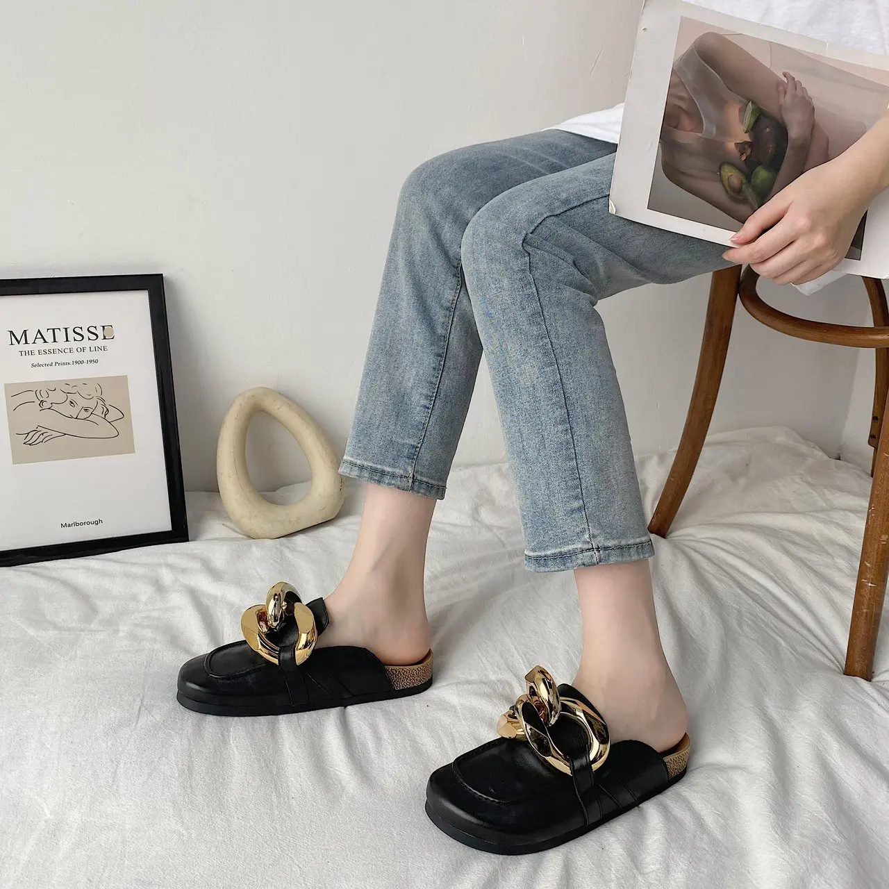 Мюли женские с металлической цепочкой, пляжные шлепанцы на платформе, круглый носок, сланцы, летняя обувь, Прямая поставка