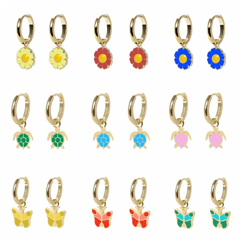 Женские серьги-кольца с эмалью, в виде маргаритки, бабочки, черепахи