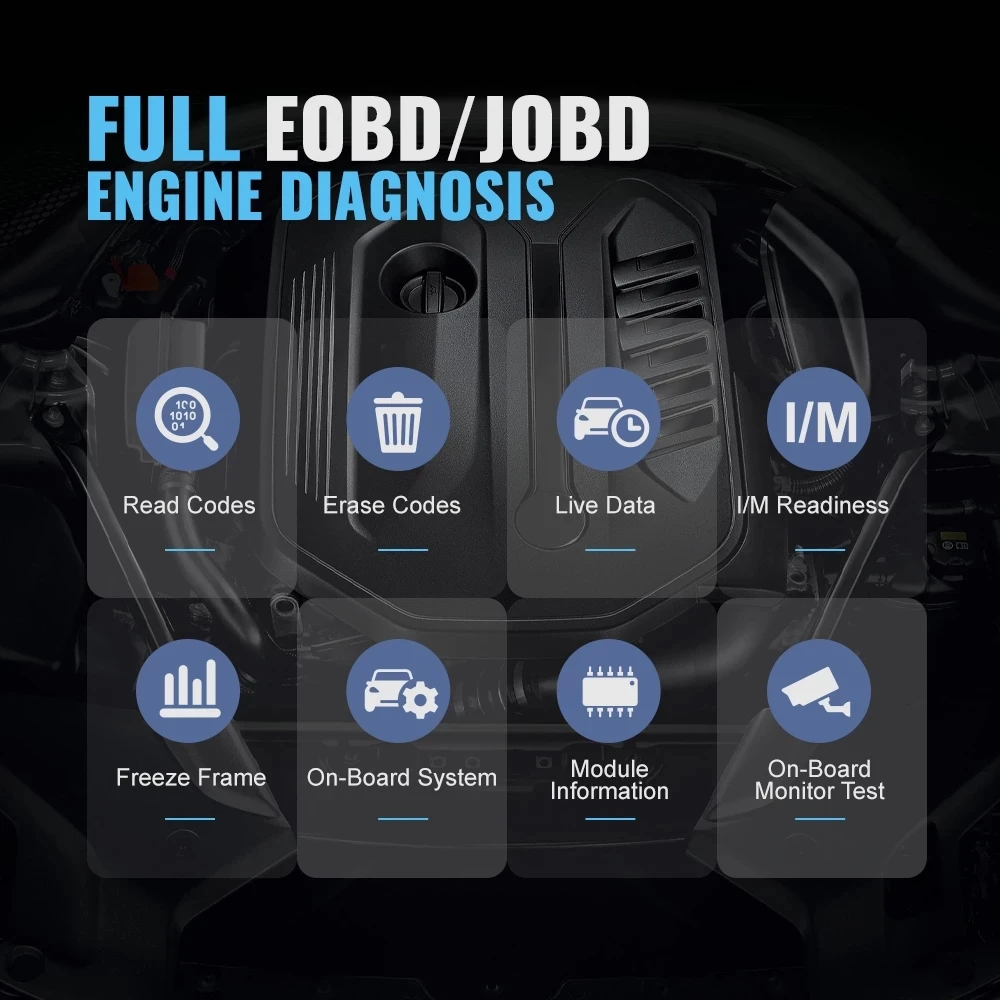 ????1. Коды чтения: Показать подробное описание диагностического кода неисправности (DTCs) ????2. Стирание кодов и сброс: Отключает контрольный светильник двигателя (MIL), очищает коды и сбрасывает мониторы. ????3. Поток данных: Считывает и отображает живой поток данных ECU/PCM, графически выполняет функции печати и хранит данные о замораживании кадра. ????4. Состояние готовности I/M: Показывает, работают ли различные системы, связанные с выбросами, на транспортном средстве должным образом и готовы к проверке и испытанию на техническое обслуживание. ????5. Чтение прямого потока данных: Показать информацию о непрерывном потоке данных от транспортного средства в режиме реального времени (сигнал) дисплей. ????6. Просмотр данных о кадре замораживания: Проверьте определенные условия транспортного средства, которые записываются бортовым компьютером в момент возникновения неисправности, связанной с выбросами. ????7. Испытание датчика O2: Позволяет извлекать и просматривать результаты испытаний сенсорного монитора O2 для самых последних испытаний с бортового компьютера транспортного средства. ????8. Бортовой монитор тест: Извлекает и отображает результаты испытаний компонентов и систем, связанных с выбросами. ????9. Чтение информации о транспортном средстве: Отображение информации, такой как VIN (идентификационный номер транспортного средства), CID (калибровочный идентификатор) и CVN (калибровочный контрольный номер) и т. Д. ????10. Проверка компонентов: Определенные компоненты транспортного средства могут приводиться в действие с помощью команд, отправленных со сканера для проверки их работоспособности.