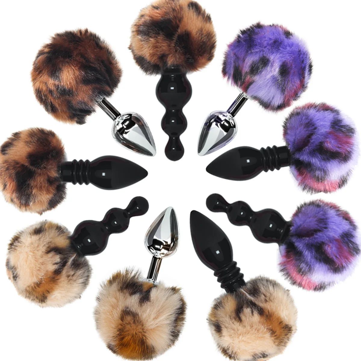 Анальная пробка с кроличьим хвостом, из нержавеющей стали, с леопар...