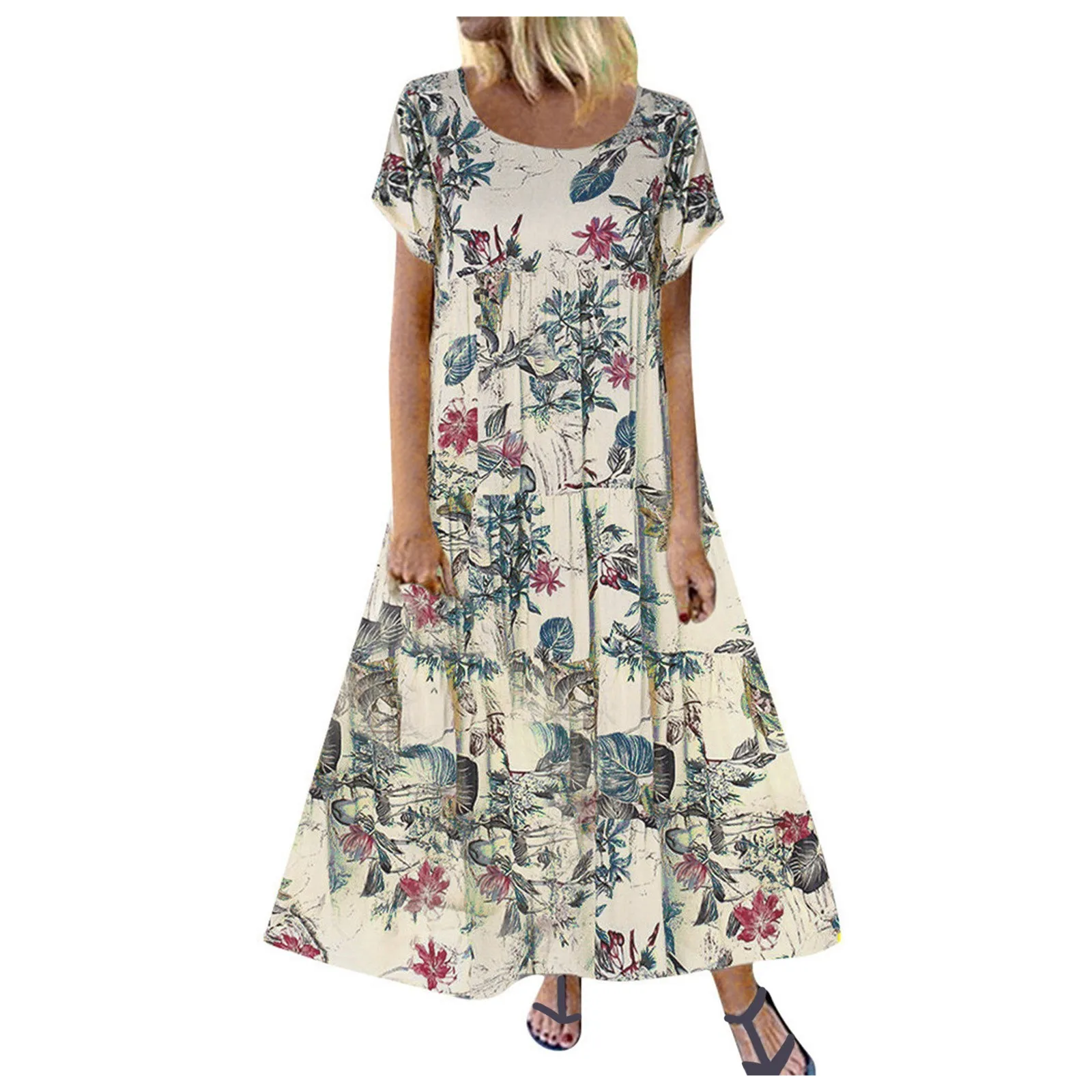 Летние модные топы для женщин размера плюс, Повседневная футболка с короткими рукавами в стиле Бохо льна в стиле ретро с принтом длинное Платье На пуговицах сзади Mujer Сарафан Платье На Лето