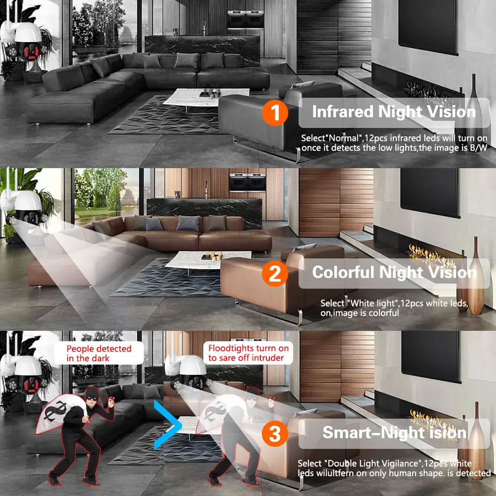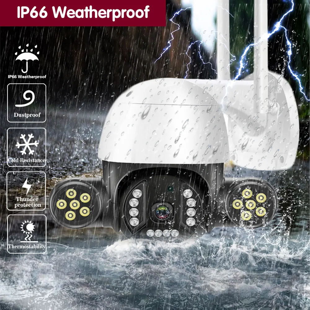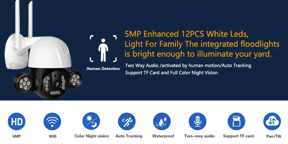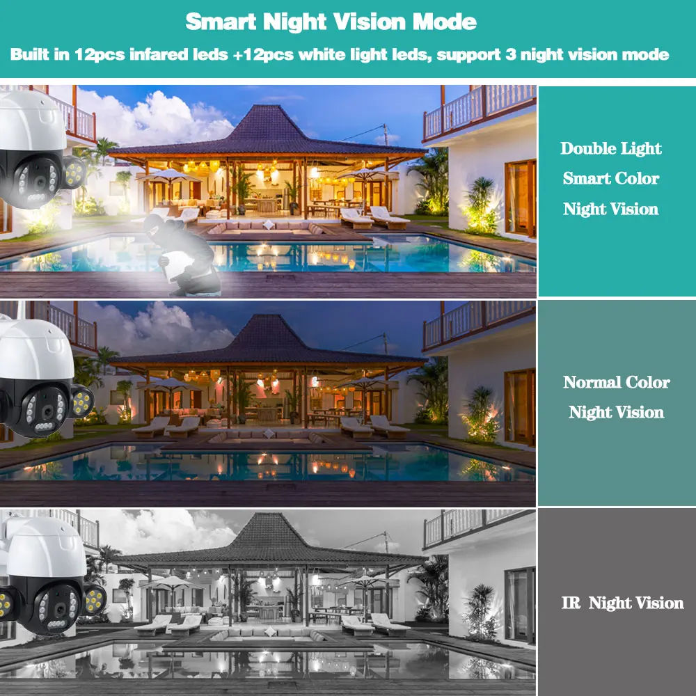 Когда кто-то ворвется в область съемки, камера сделает звуковой сигнал и сигнал тревоги будет передвинут в приложение вашего телефона. И когда он обнаруживает движение, 12 белый светодиодный светильник s будет светильник, показывая вам цвет ночной сцены.