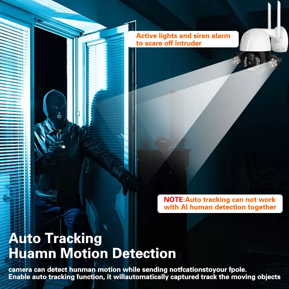 Он может обнаруживать движение hunman во время отправки уведомлений на ваш телефон, включать функцию автоматического отслеживания, он автоматически захватывает треки движущихся объектов.