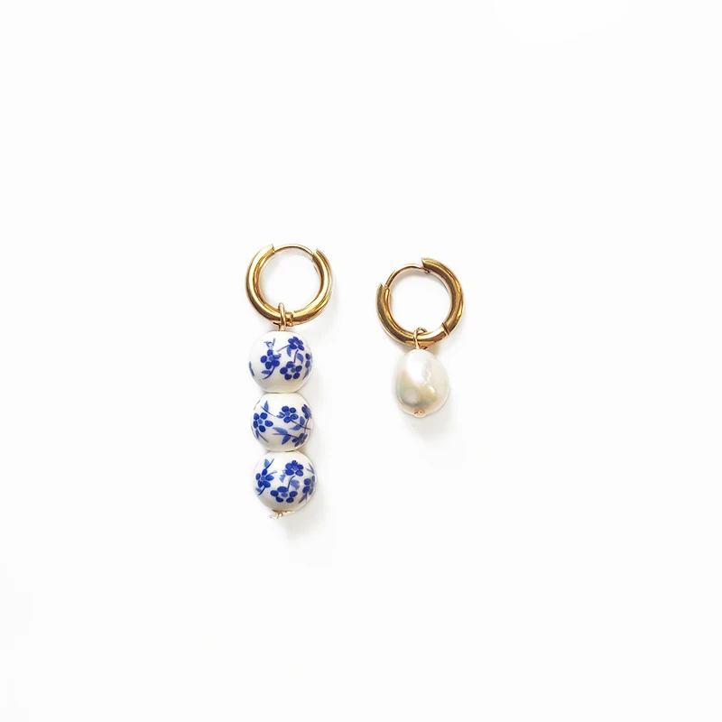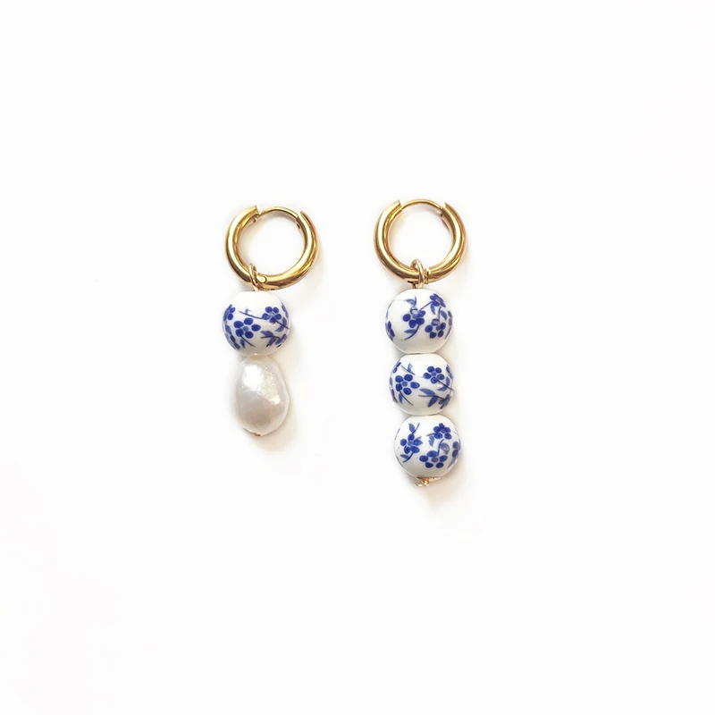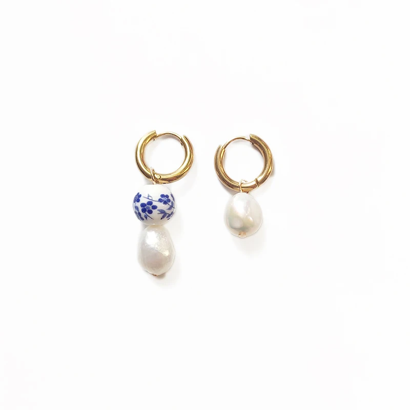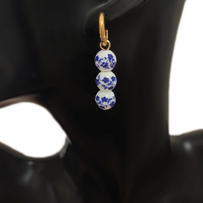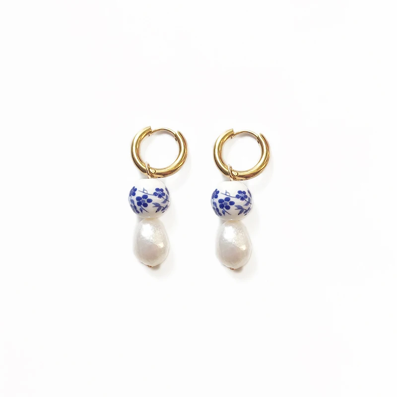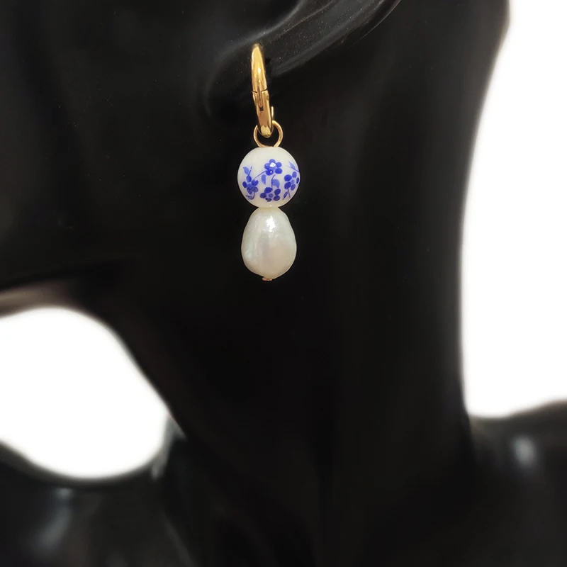 Серьги с подвеской из натурального жемчуга в этническом китайском стиле, керамические бусы с голубым цветком, женские трендовые очаровательные Обручи из нержавеющей стали 2021