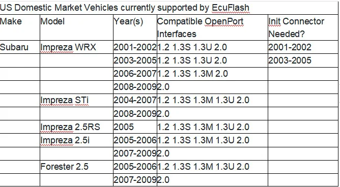 Посылка:1 шт. x Openport 2,0 + ecupflash кабель1 шт. х USB кабель2 шт. x CDOpenPort 2,0 в сочетании с нашим программным обеспечением EcuFlash,OpenPort 2,0 способен переплавлять большое количество новыхДля Subaru и для автомобилей Mitsubishi Поддержка других автомобилей в настоящее время.Openport 2,0 + ECUFLASH кабель для Toyota, для Jaguar и для LandRover Диагностика Топ 5 причин, чтобы получить Openport 2,0 + ECUFLASH1. Обновляемое программное обеспечение2. Автономные регистраторы данных для microSD / microSDHC карты без ноутбука3. Поддерживает эти основные протоколы OBD: CAN 2,0 (CAN/ISO15765) и K-line (ISO9141/ISO14230(KWP2000)/dual K line)4.Openport 2,0 может работать для Toyota, для Jaguar и для LandRover диагностики.5. OpenPort 2,0 в сочетании с нашим программным обеспечением EcuFlash, OpenPort 2,0 способен перезаправлять большое количество новых для Subaru и для автомобилей Mitsubishi, и поддержка других автомобилей в настоящее время.Примечание: Не подключайте Интернет при использовании. Характеристики Openport 2,0 + ECUFLASH:1. 72 МГц 32-разрядный процессор2. Высокоскоростное устройство USB 2,0 (USB-A/мини-кабель в комплекте)3. Светодиоды RGB4. Возможность входа от инноваций Автоспорт 2,5 мм стерео МТС шины данных5. J2534 Поддержка доступа с Windows DLL6. Подать заявление в GND или 5V-алюминиевая крышка, 25В to OBD шпильки 1,3,9,11,12,13 или AUX 2,5 мм стерео разъемДля вспышки ecu вы можете получить информацию из этого списка: