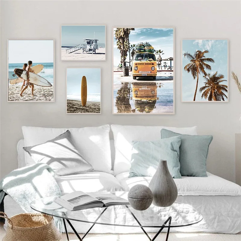 Летнее Тропическое украшение, картина, океан, пляж, кокосовое дерево, постер, доска для серфинга, плакат, пейзаж, настенное искусство, холст, живопись, домашний декор