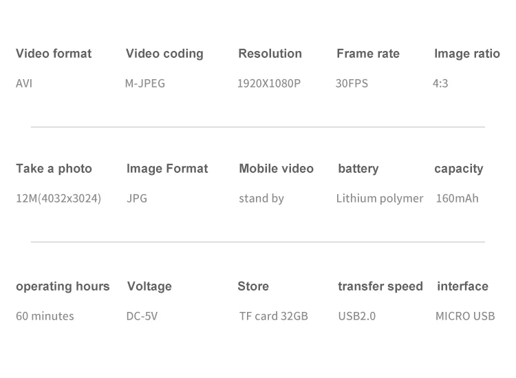 -Мини 1080P full car DVR camera recorder-Высокое разрешение full 1080P-Поддержка 32 Гб TF карта Макс. (Карта памяти не входит в комплект)-пропорция изображения: 4 : 3-Емкость аккумулятора: 200 мА · ч-Время работы: около 100 минут при 1080P 30 кадров в секунду-Время зарядки: около 2 - 3 часов-Напряжение зарядки: 5 в постоянного тока-Тип интерфейса: мини 8 pin USB-Длина кабеля: 80 см-Встроенная литиевая батарея устойчивая камера до 60 минут