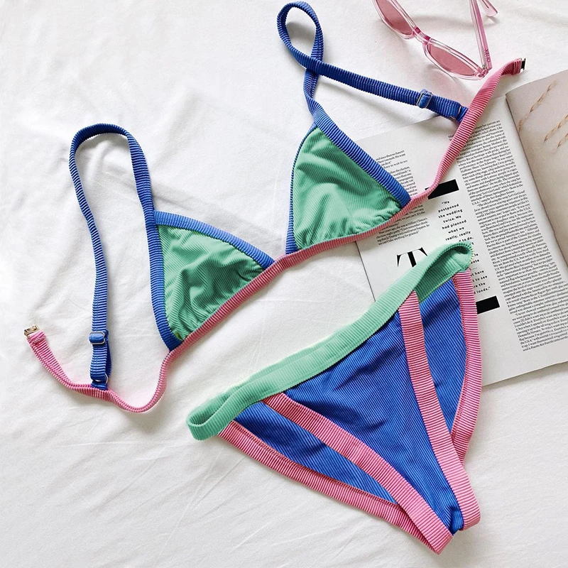 2021 сексуальный треугольный купальник в стиле пэчворк, женский купальник в рубчик, купальник с высокой посадкой, спортивный купальный костюм, пляжная одежда