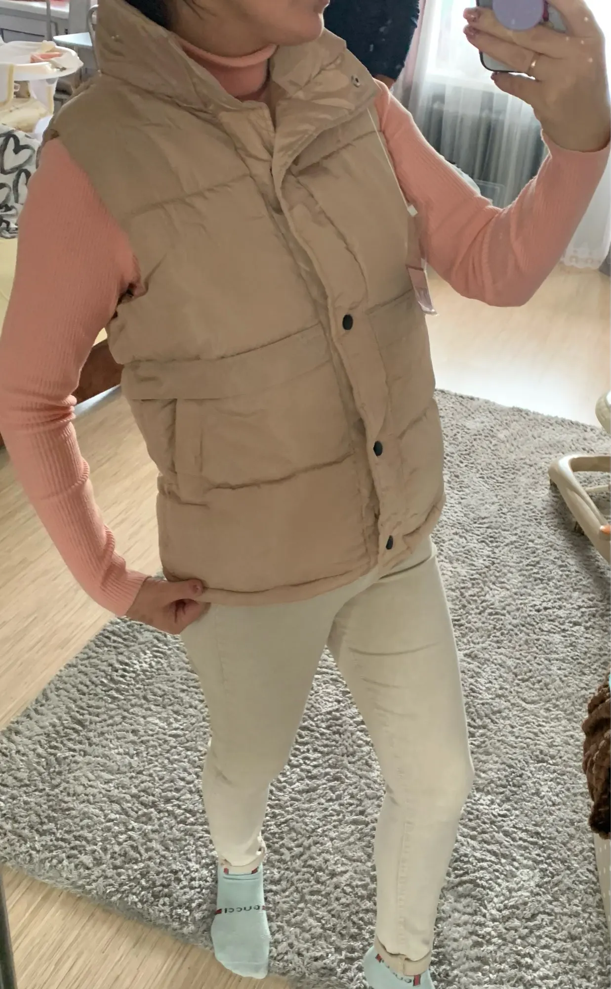 Жилетка хорошего качества, очень плотная, не продувает. Понравилось, что кнопки черные, смотрится хорошо на контрасте. Цвет кофейный в реальности гораздо светлее. На свой размер S заказала М, можно было и меньше заказывать, но под плотную толстовку будет хорошо смотреться. Ткань с блеском, вот это не очень понравилось