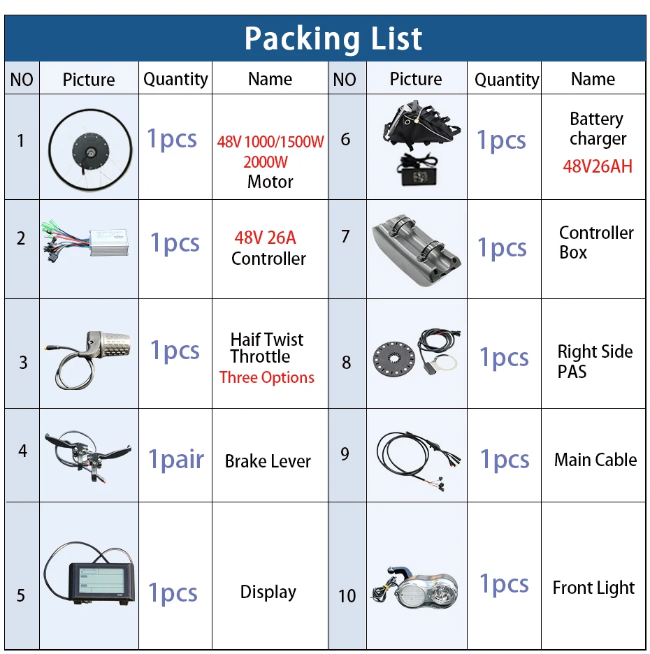 Упаковочный лист комплекта для преобразования электрического велосипеда показан на следующем рисунке, у них есть моторное колесо, контроллер, дроссельная заслонка, тормозной рычаг, ЖК-дисплей, аккумулятор, pas, водонепроницаемый основной кабель и другие аксессуары.
