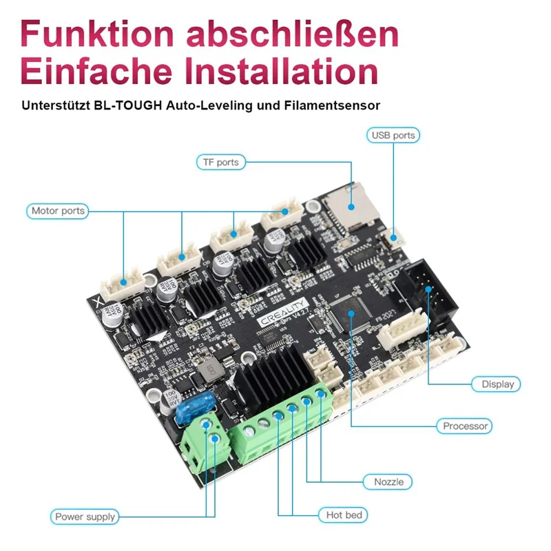 Плюсы: он действительно тихий. При первой печати это настоящий эффект Вау. Я не могу слышать шума от моторов, просто вентиляторы. Он предназначен для BL touch и датчика накаливания. На самом деле это plug and play (кроме экструдера). Предварительно установленная прошивка. Cons: мне нужно было вращать провода в экструдерном коннекторе, потому что экструдер бегал назад. Есть новый разъем micro-usb, поэтому мне нужно купить новый кабель для подключения к ПК (в старой материнской плате есть разъем mini-usb).