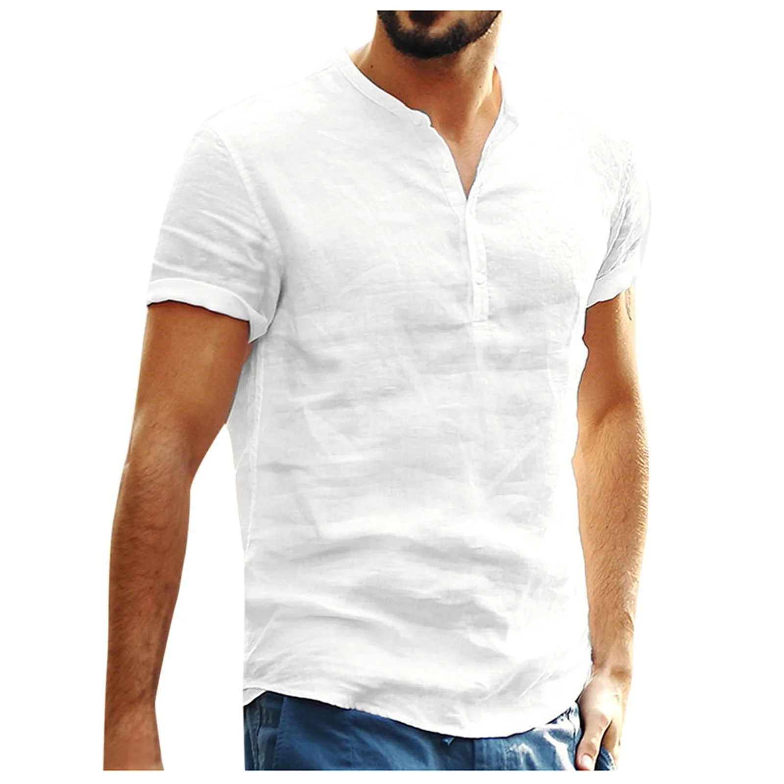 Рубашка мужская с воротником-стоечкой, винтажная блуза Slim Fit, блуза из хлопка и льна с короткими рукавами, однотонная, на пуговицах, лето