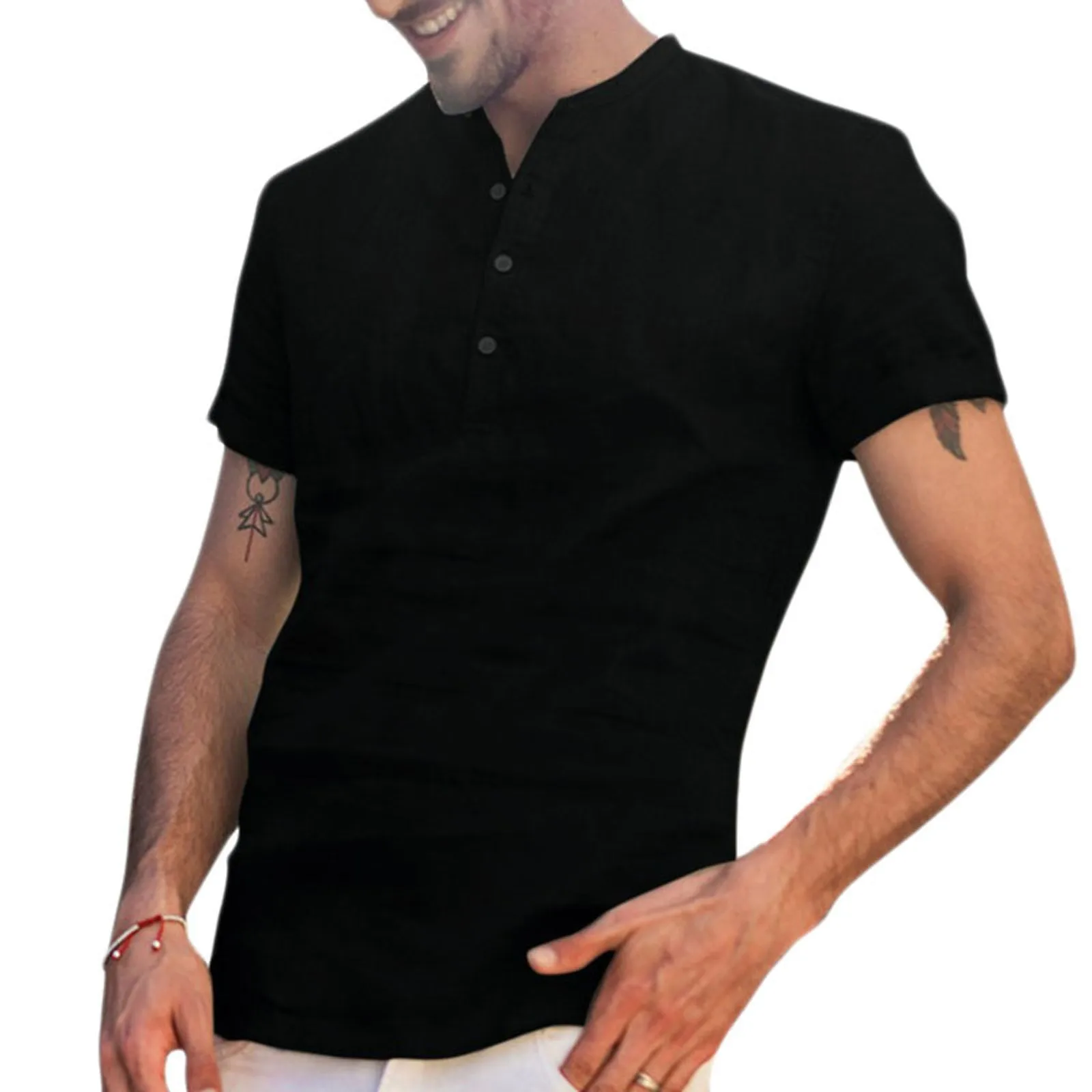 Мужская Летняя Однотонная рубашка из хлопка и льна с воротником-стойкой и короткими рукавами