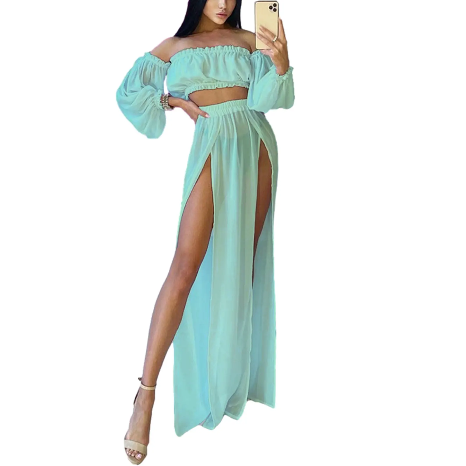 Костюм женский с футболкой и юбкой, модный однотонный Топ без бретелек с длинным рукавом и свободная Длинная накидка с разрезом, на лето