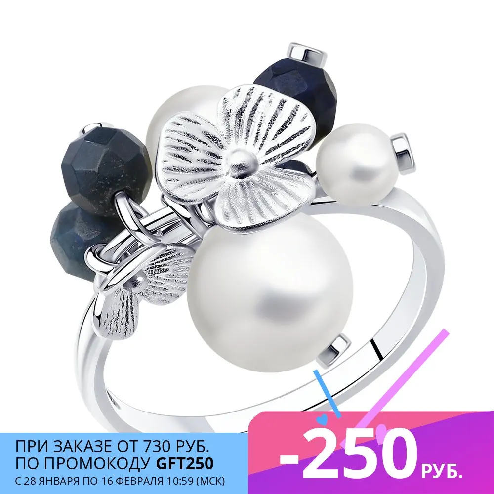 Кольцо SOKOLOV из серебра с содалитом и синтетическим жемчугом, Серебро, 925, Женское, Оригинальная продукция