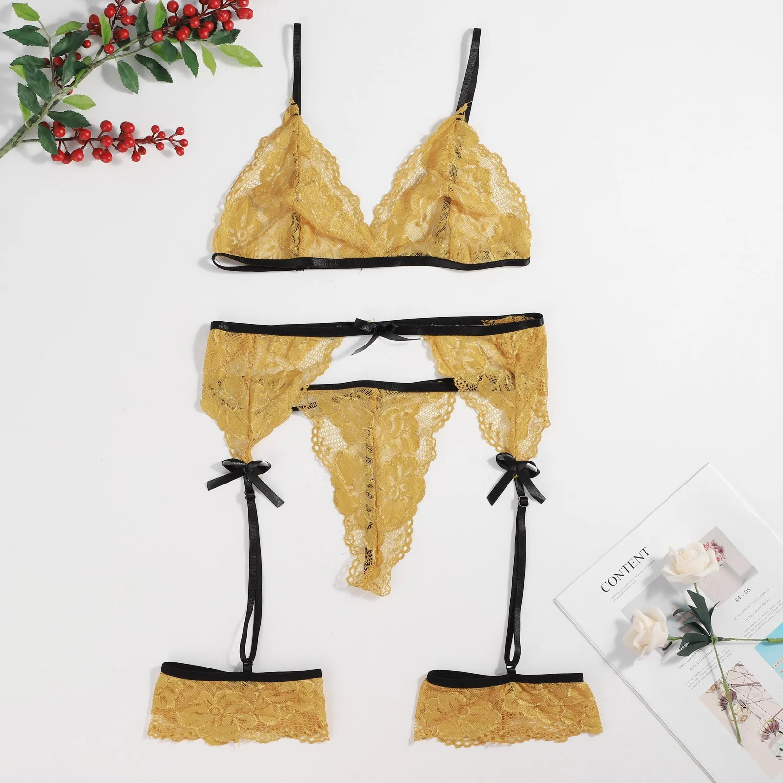 Женское кружевное белье в цветочек, набор прозрачного экзотического нижнего белья, кружевной бюстгальтер, стринги, подвязка, комплект из 3 предметов, сексуальное ночное белье, Bielizna Erotyczna