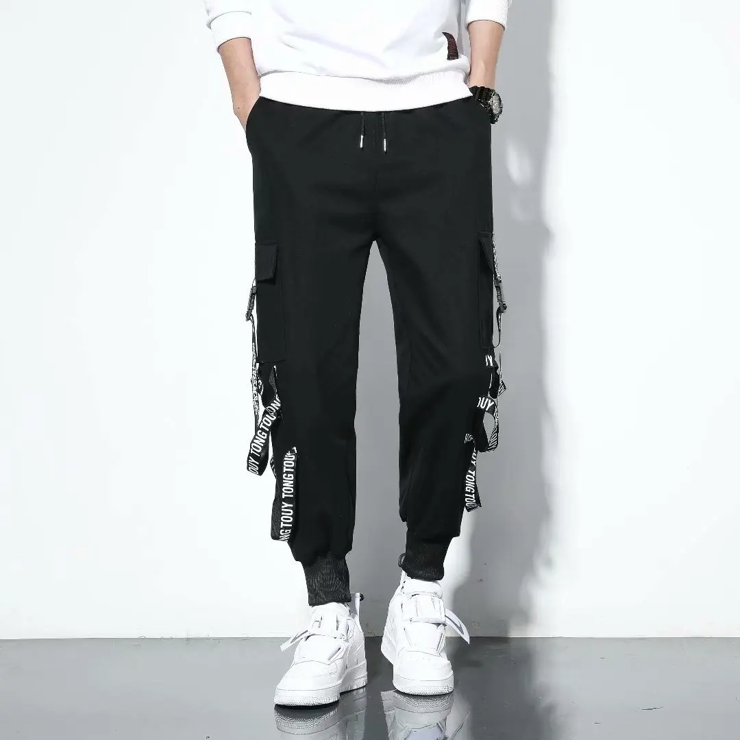 Штаны мужские в стиле Харадзюку, уличная одежда, модные джоггеры, брюки-карго с лентами, повседневная одежда с эластичным поясом