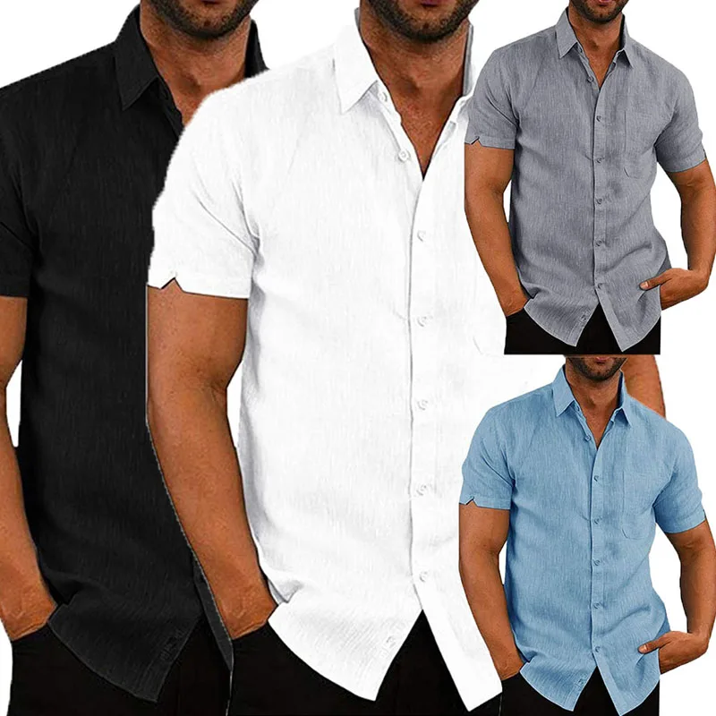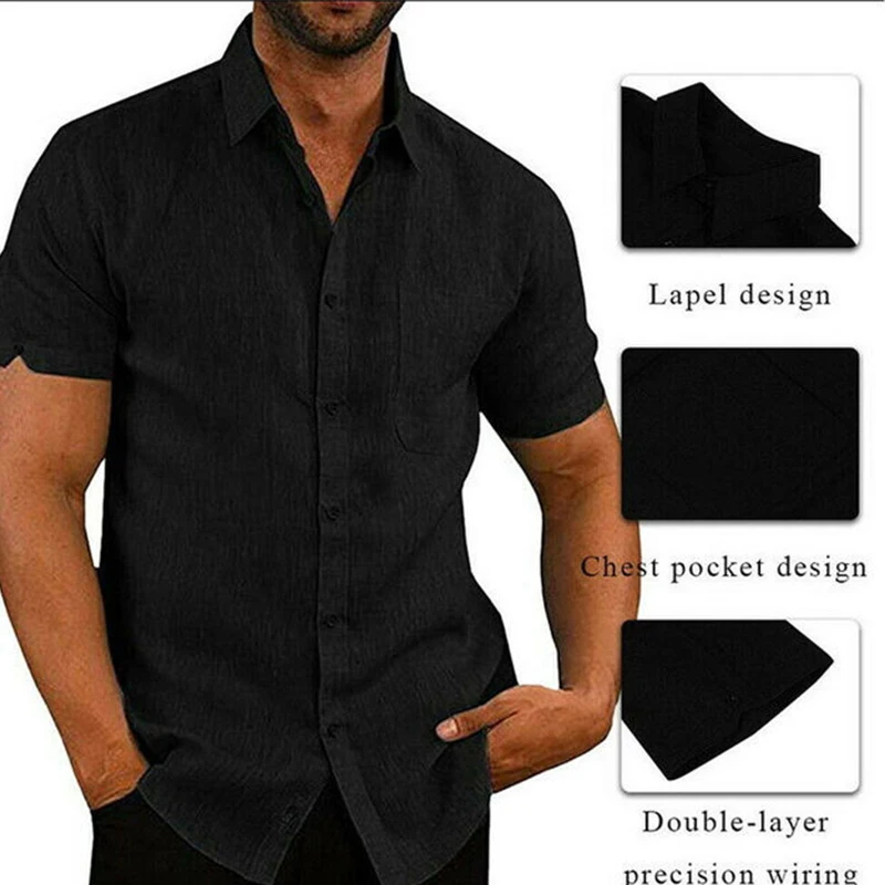 Рубашка Мужская льняная с коротким рукавом, свободная Повседневная блуза из чистого хлопка и льна, на пуговицах, однотонная Удобная футболка для отдыха, лето
