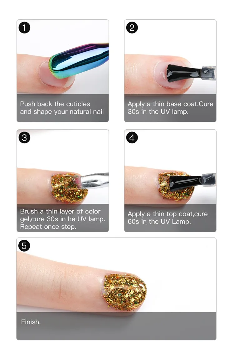 Цвет будет держать блеск до 30 дней. Горячие цвета на выбор, подходят на все случаи жизни. Шаг за шагом: 1. Придайте ногтю форму. Слегка отполируйте поверхность ногтевой пластины. Средство. 2. Нанесите базовый слой основы от кутикулы до свободного края (не забудьте закрыть край ногтя). Высушите ногти под светильник кой в течение 10 секунд или под УФ-светом в течение 2 минут. 3. Нанесите тонкий слой гель-лака выбранного цвета (удаляется замачиванием). Свободный край крышки. Выдержка: 30 секунд светодиодный Ной лампе или 2 минуты в УФ-лампе. 4. Нанесите 2-й тонкий слой гель-лака на ногти. Подержите под светодиодной лампой в течение 30 секунд или под УФ-светом в течение 2 минут. 5. Нанесите верхний слой. Свободный край крышки. Выдержка: 30 секунд в светодиодный Ной лампе. 6. Удалите липкие остатки на ногтях с помощью очищающего средства. Затем нанесите питательное масло для кутикулы, чтобы увлажнить кутикулу и кожу вокруг ногтя. Удаление: 1. Смочите ногти в жидкости для снятия акрила примерно на 5 минут. 2. Аккуратно разделите целый кусок эмали на каждый ноготь.
