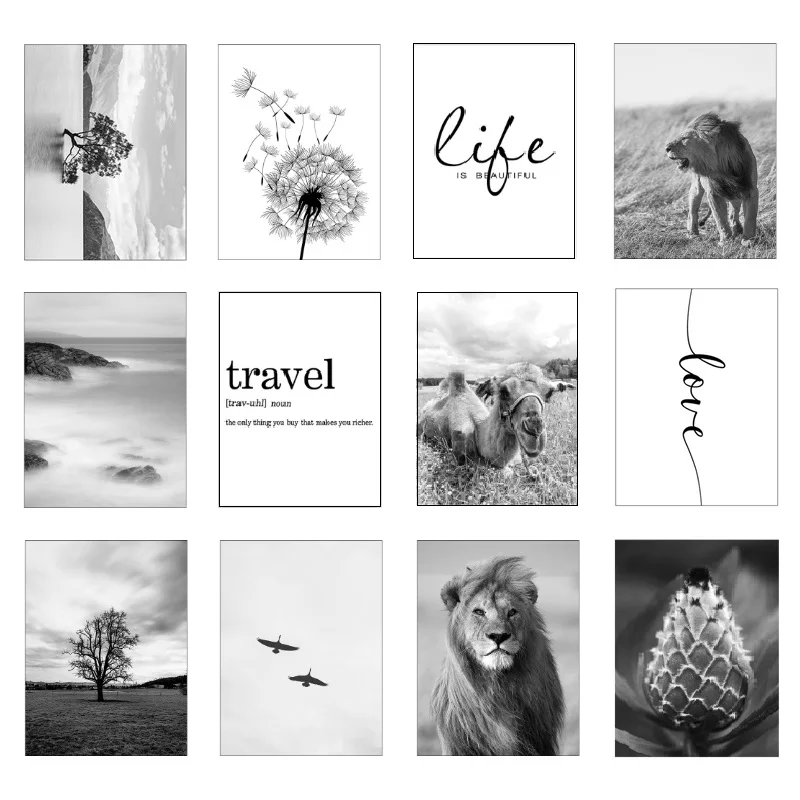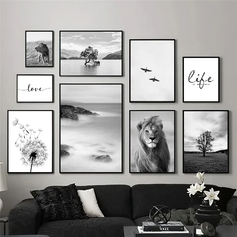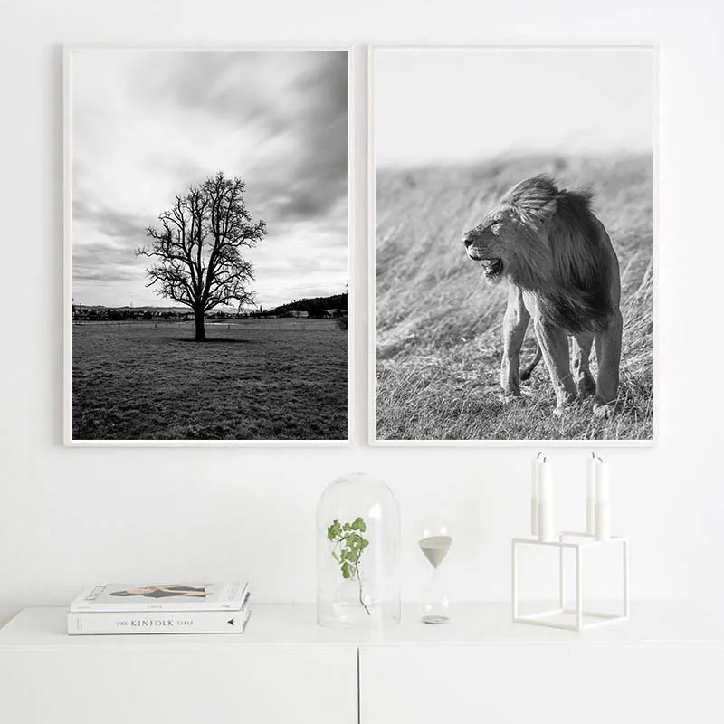Черный, белый цвет Лев птица стены искусства плакат Природа Дерево пейзаж живопись на холсте скандинавский принт современная картина рисунок на стену для домашнего декора
