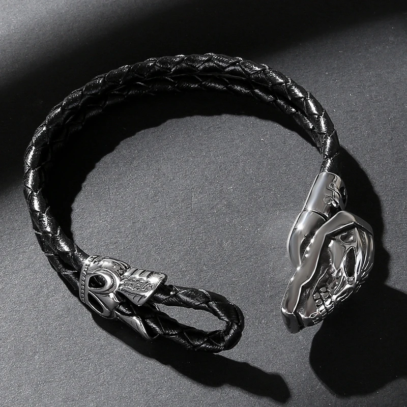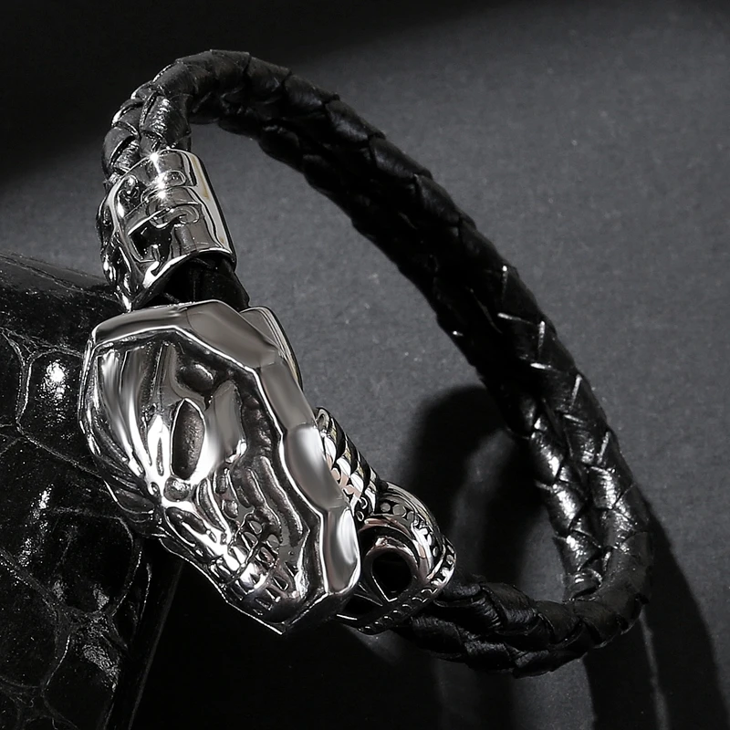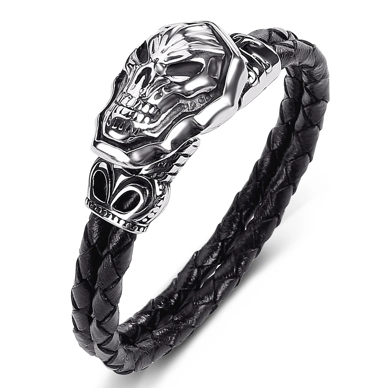 Новый дизайн, мужской кожаный браслет с черепом из нержавеющей стали, панк-рок, ювелирные изделия, мужской браслет на руку скелет, плетеный браслет, P532