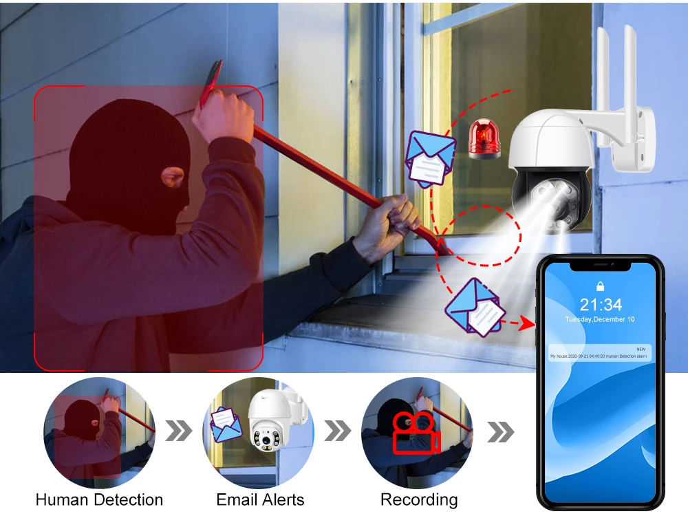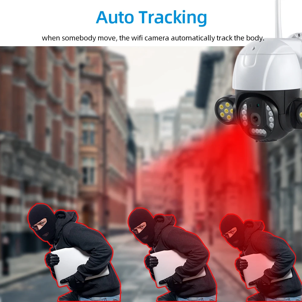 Он может обнаруживать движение hunman во время отправки уведомлений на ваш телефон, включать функцию автоматического отслеживания, он автоматически захватывает треки движущихся объектов.