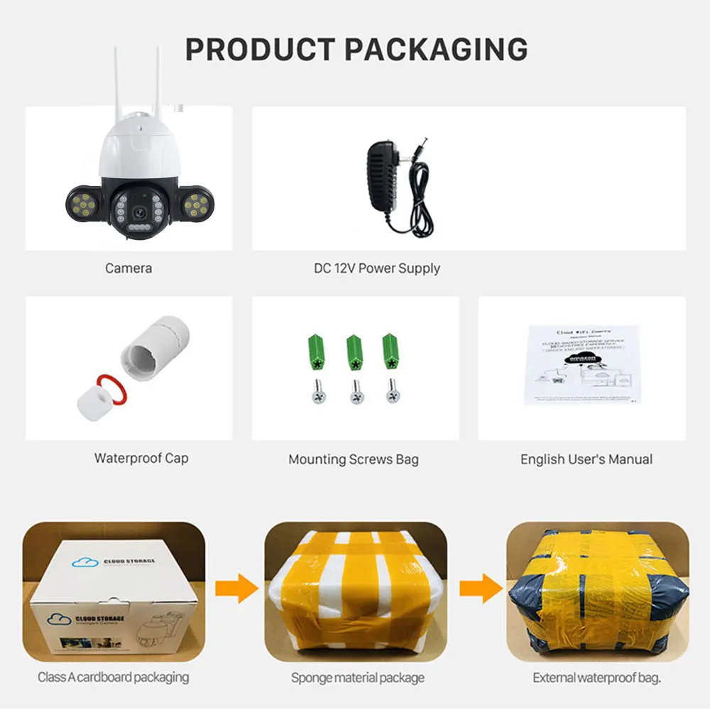 Когда кто-то ворвется в область съемки, камера сделает звуковой сигнал и сигнал тревоги будет передвинут в приложение вашего телефона. И когда он обнаруживает движение, 12 белый светодиодный светильник s будет светильник, показывая вам цвет ночной сцены.