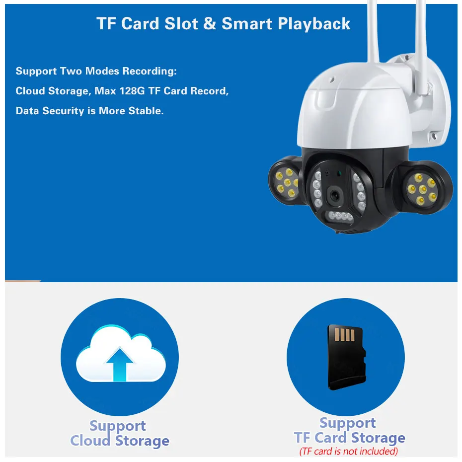 Камера поддерживает Локальное резервное копирование до 128 Гб TF карты, а также предоставляет Облачное хранилище (необходимо оплатить дополнительные расходы).