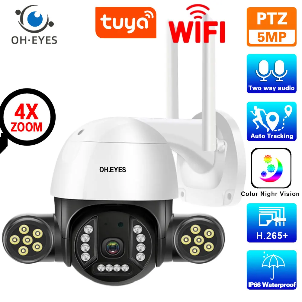 Умная купольная IP-камера Tuya для системы видеонаблюдения, уличная 2-канальная Беспроводная PTZ-камера наблюдения с поддержкой Wi-Fi, 5 МП, с функцией автослежения, H.265