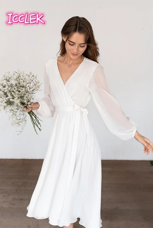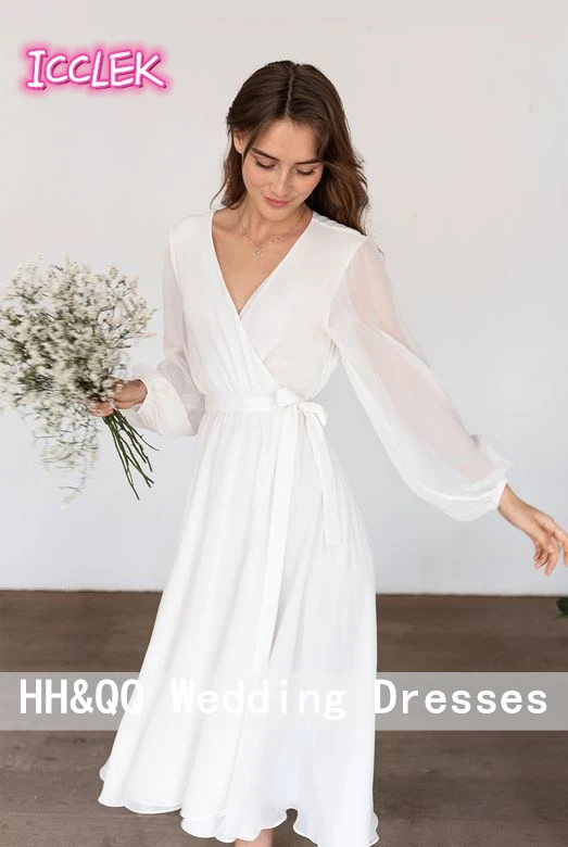 Простое шифоновое пляжное свадебное платье в стиле бохо, а-силуэт, с V-образным вырезом и длинными пышными рукавами, Элегантное свадебное платье по индивидуальному заказу