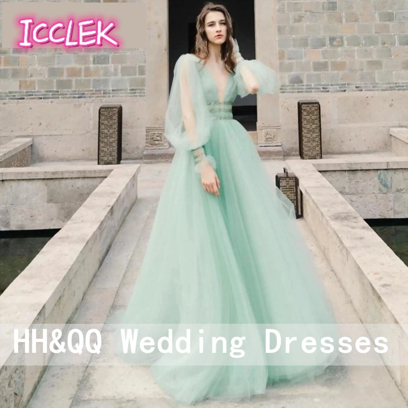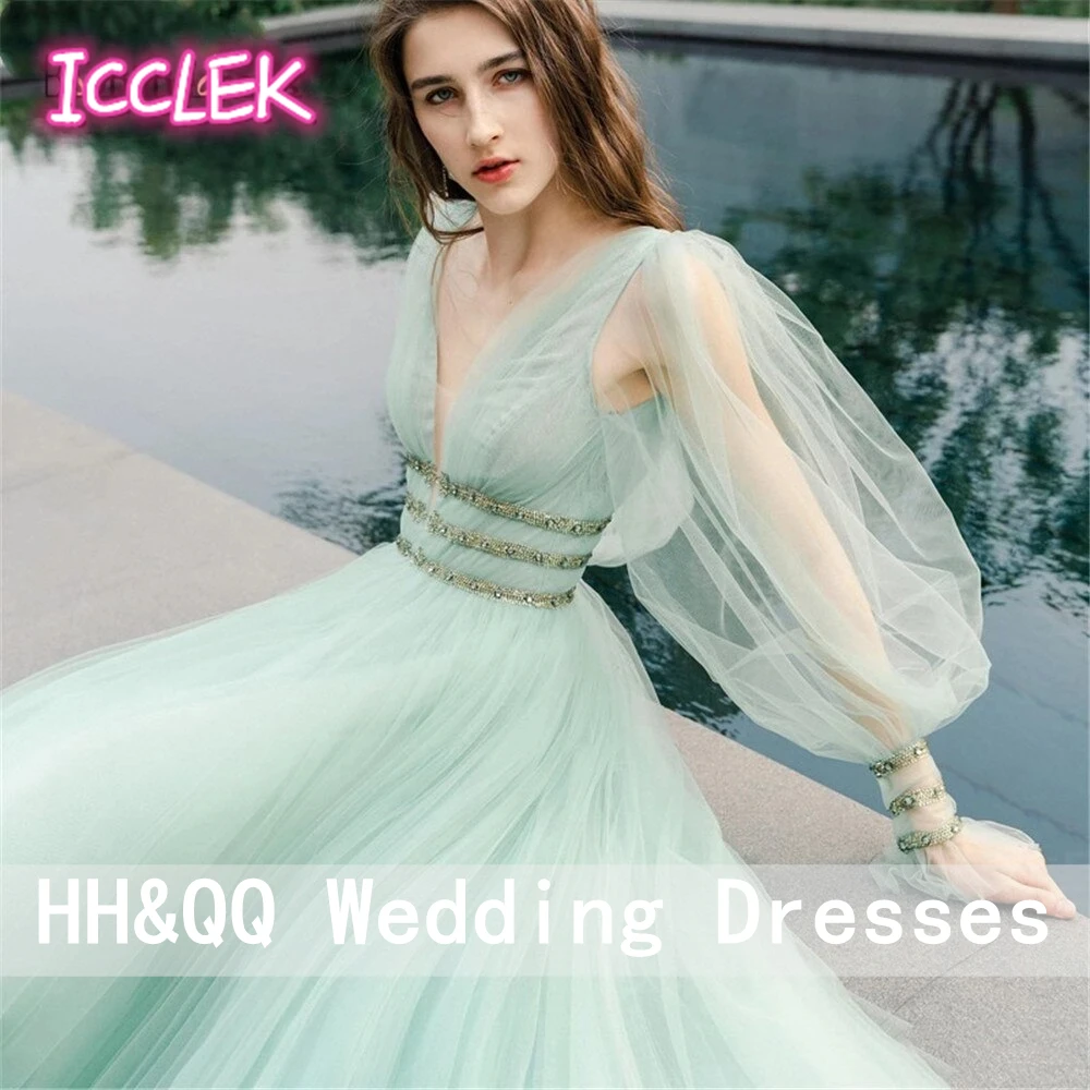 Очаровательное Тюлевое пляжное свадебное платье в стиле бохо А-силуэт с V-образным вырезом длинными пышными рукавами длиной до пола Элегантное свадебное платье на заказ