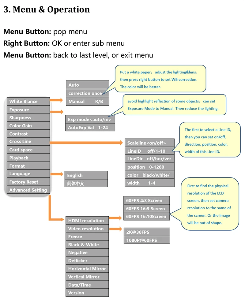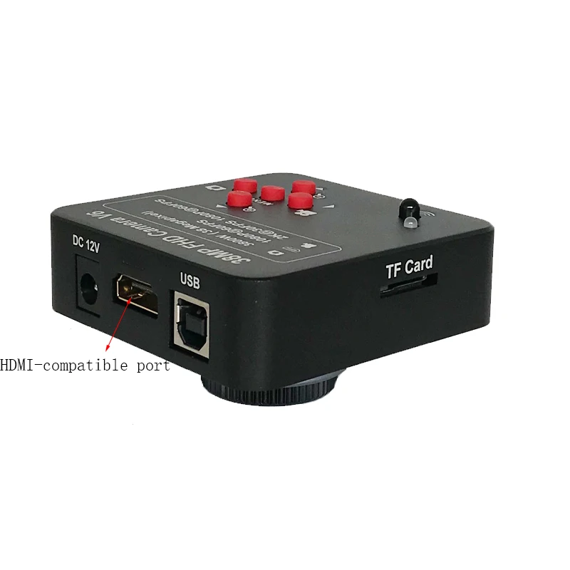 Датчик Panasonic:38 мегапикселей, 38 миллионов пикселей CMOSОптический формат: 1/1/2 дюймаРазмер пикселя: мкм x мкмИнтерфейс: Совместимый с HDMI порт (тип A).USB (тип B).TF-картаРазрешение изображения: 21 МПРазрешение записи видео: 2K @ 30FPS 1080p @ 60FPSРазрешение, совместимое с HDMI: 1920*1080p, 60 кадров в секундуМожет выводить с помощью USB одновременноСовместимые с HDMI Весы: Поддержка 4:3,16:9,16:10 экранUSB2.0 (без дисковода):1920*1080 @ 30FPS 1280*720 @ 30FPS 640*480 @ 30FPSМожет выводить с HDMI-совместим одновременноTF-карта: до 64 ГБAWB: цветокоррекция WB/автоматический/ручнойНезависимая Установка значений R.G.BЭкспозиция: Автоматическая/ручная. Можно установить значение AEПоперечные линии: 8 линий. Можно установить цвет, ширину и положениеЛинии отметки шкалы: 2 линии.Пунктирные линии: 2 линии. Можно установить цвет, ширину и положениеУсиление контрастности цветов резкости: ПоддержкаМоно отрицательный: ПоддержкаЗеркало: горизонтальное вертикальное зеркалоЯзык: английский/упрощенный китайскийЦифровой зум: ПоддержкаИК-пульт: ПоддержкаНапряжение в: 12 В постоянного тока 55-21 мм РазмерПотребляемая мощность: макс. 0,15 Вт, 12 В, аИнтерфейс объектива: C/csВес нетто: 180 гВес брутто: 400 гРазмер камеры: 74*74*35 ммРазмер упаковки: 160*100*80 ммРешения вопросов:ЖК-дисплей без видео или мерцания1. Проверьте источник питания. Проверьте зеленый светодиодный включенным. Нажмите кнопку питания, чтобы включить ее.2. Проверьте крышку объектива. Увеличьте освещение.ЖК-дисплей с черной полосой изображения1. Изменение разрешения ЖК-дисплея2. Изменение разрешения камерыЕсть грязные пятна1. Проверьте камеру и объектив, найдите пыль, затем очистите с помощью абсолютного этилового спирта или очищающего средства