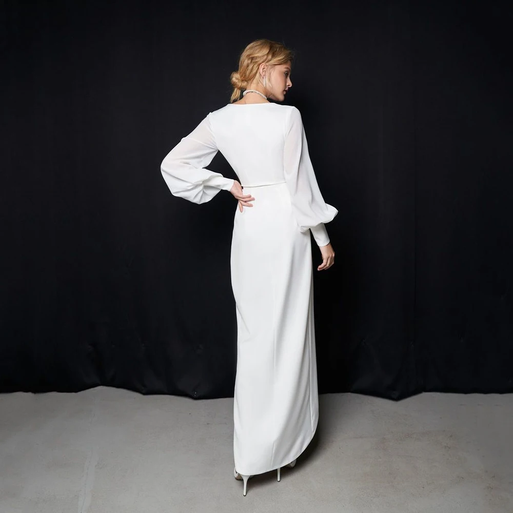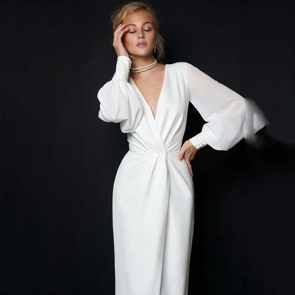 Женское атласное свадебное платье UZN, белое платье невесты с V-образным вырезом и длинными рукавами-фонариками, платье с высокой низкой юбкой и разрезом