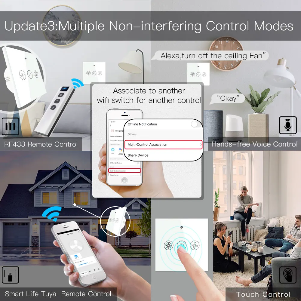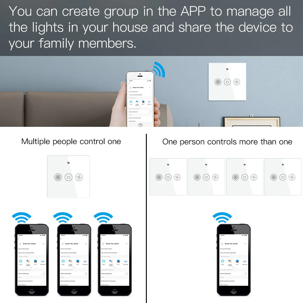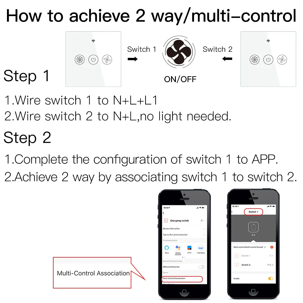 1,2/3-way multi-control association для управления 1 потолочным вентилятором с несколькими переключателями; Панель из закаленного стекла с защитой от царапин подходит для любого домашнего декора и обеспечивает легкое сенсорное управление; вы можете связать этот переключатель с несколькими различными переключателями в приложении Smart Life.2. Режим управления без помех; Позволяет управлять переключателем через умную жизнь, сенсорное управление, голос и пульт дистанционного управления с частотой RF433 и дистанционным переключателем кодирования 1527 (не входит в комплект); каждый метод управления работает независимо; Достичь мульти-контроля, связываясь с другими смарт-переключателями3. Совместимость с Alexa и Google Home для голосового управления без рук; Также можно управлять через приложение Smart Life/Tuya в любое время и в любом месте; Настройка статуса реле и запоминание последнего статуса реле опционально при выключении питания, включение/выключение подсветки.4. Возьмите полный контроль за подключенными приборами с таймером, расписанием и обратным отсчетом (1/5/30 минут, 1 час и т. д.) с приложением; Поделитесь контролем с семьей и друзьями для дополнительного удобства5. Нейтральный провод требуется в вашем воздушными выключателями коробки переключателей правильной работы; Поддерживает только 2,4 ГГц сети; Предлагает легче сопряжения через подключение по Wi-Fi и Bluetooth; включает в себя полную 2-годовая гарантия и 60 дней гарантия возврата денег для полного удовлетворения.