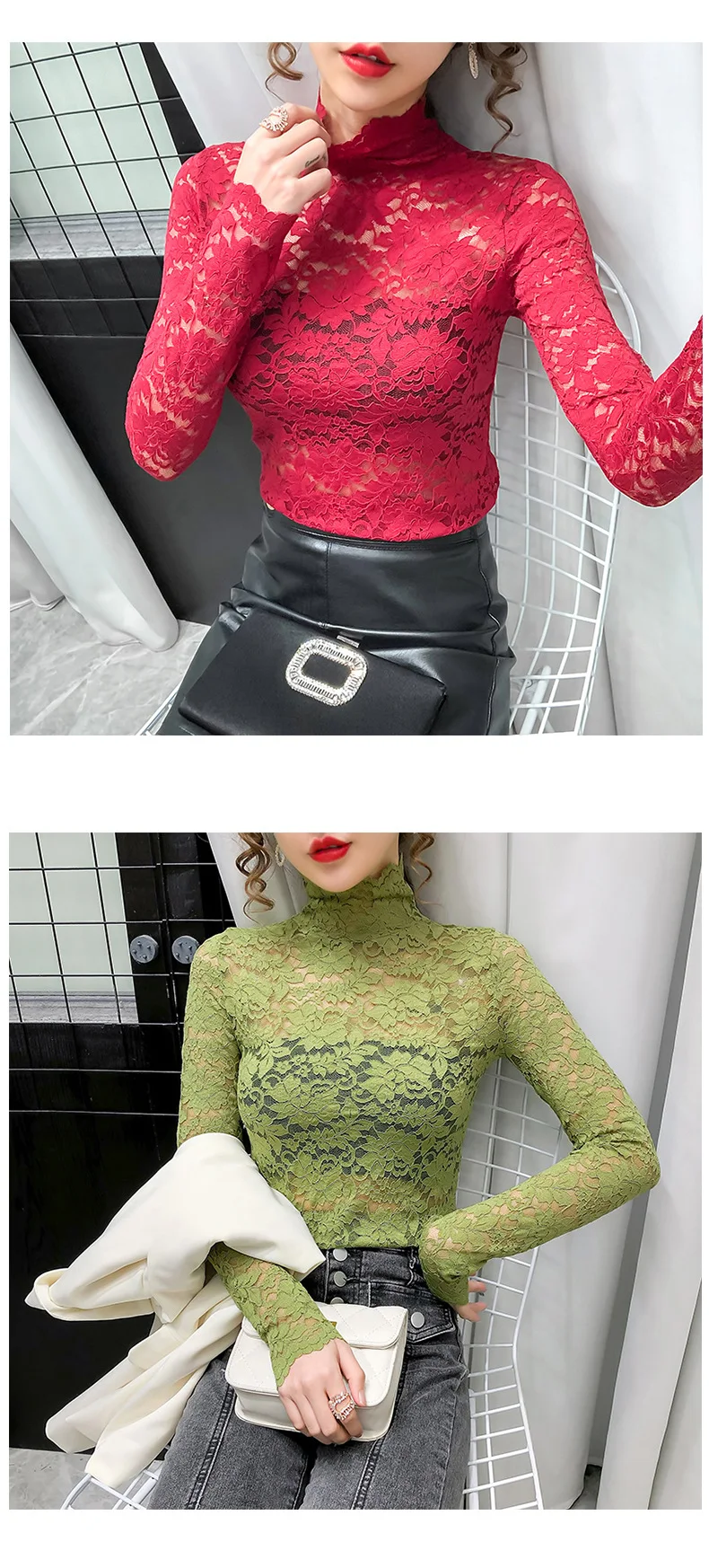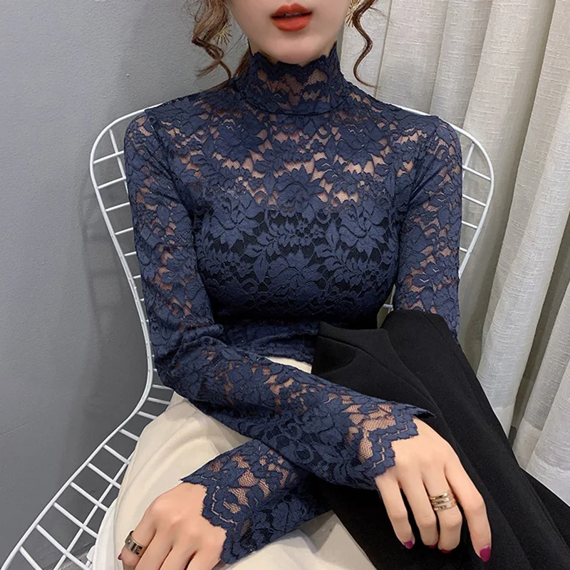 Блузка Женская осенне-зимняя облегающая кружевная рубашка с высоким...
