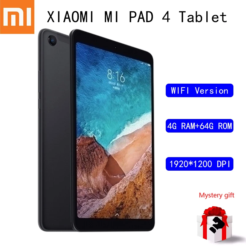 Xiaomi Mi Pad 4 Экран: 8 дюймов, 1920*1200 FHD, 16:10 Соотношение экрана Процессор: Qualcomm 660 AIE Оперативная память: 3/4 ГБ ПЗУ: 32/64 Камера: Передняя 5 Мп./задняя 13 МП (поддержка PDAF фраза фокус) Аккумулятор: 6000 мАч (поддержка 5 В/2 а) Сеть: WIFI/4G LTE версия Навигация и позиционирование: версия WiFi/не поддерживает навигационные услуги;/версия 4G LTE/GPS · ГЛОНАСС · Beidou Операционная система: MIUI 9 (база на Andorid 8,1) Размер: 200,2*120,3*7,9 мм (342,5 г)/149,08*245,6*7,99 мм (485 г) Цвет: черный/золотой (металлический корпус) Посылка: MI pad 4/адаптер питания/кабель USB Type-C/Pin/Руководство по запуску/три ваучера