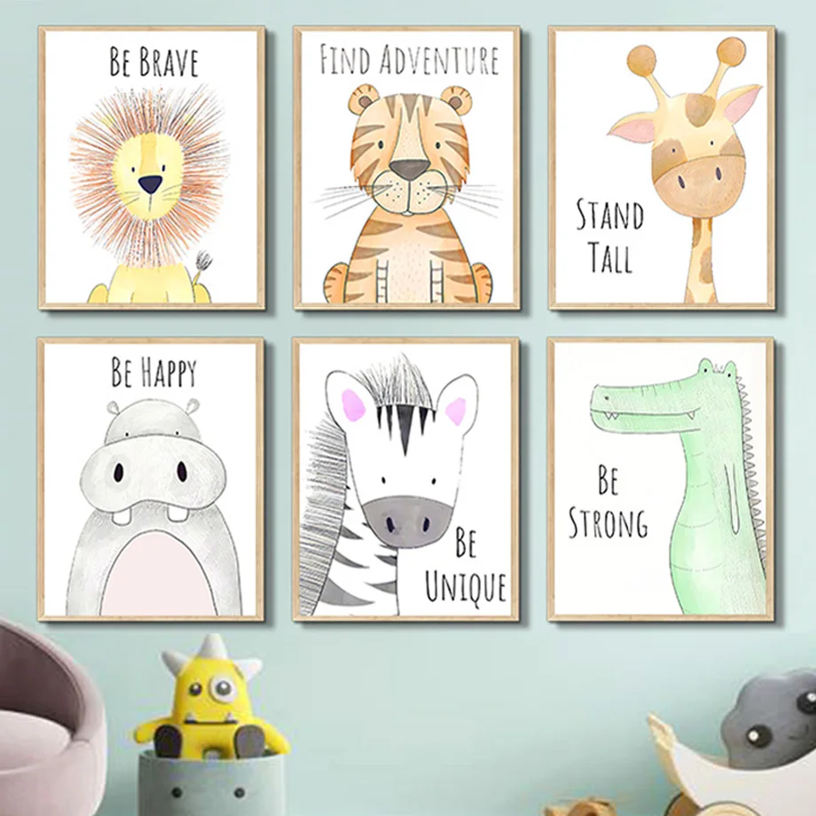 Жираф Тигр Лев Бегемот Be Happy Brave детская настенная живопись на холсте скандинавские плакаты и принты настенные картины декор детской комнатыМатериал: экологически чистый хлопокХарактеристика: солнцезащитный, водонепроницаемый, никогда не выцветает