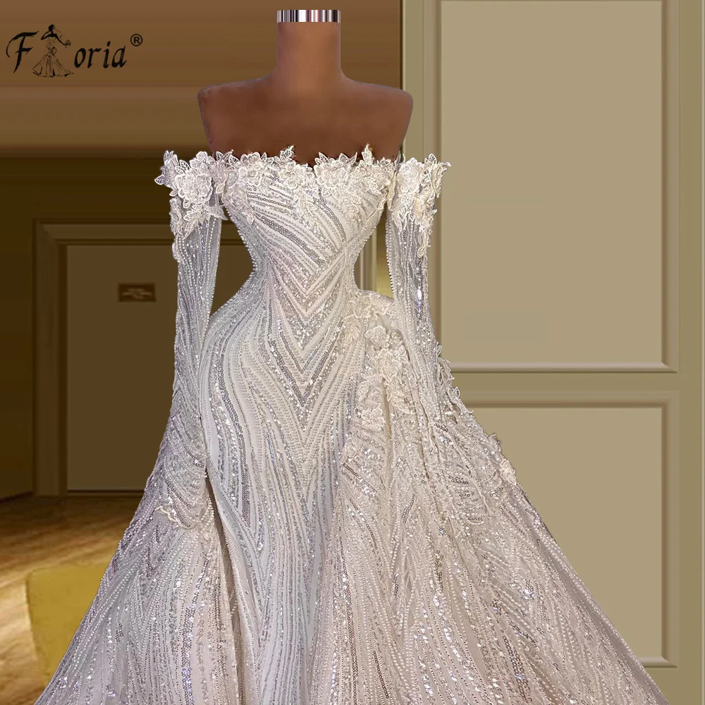 Очаровательное свадебное платье с открытыми плечами и блестками, свадебное платье с юбкой годе, Кружевная аппликация из бисера, свадебное платье со съемным шлейфом для невесты, 2021