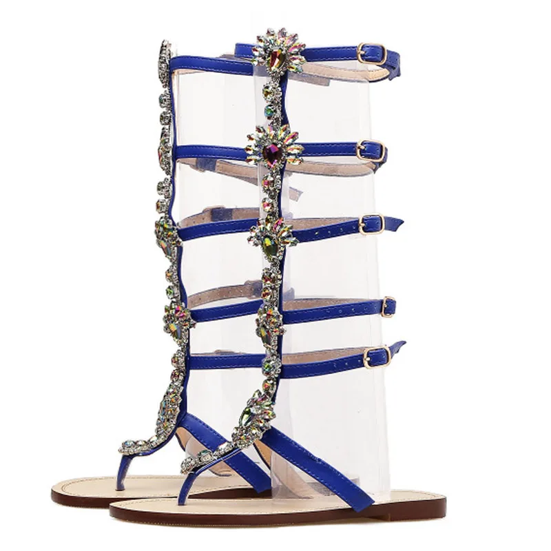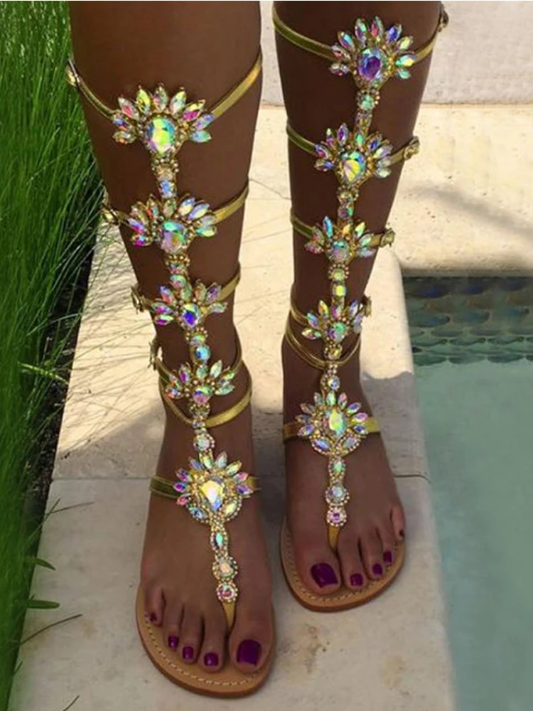 Летние женские ботинки на плоской подошве; Вьетнамки; Босоножки в стиле Гладиатор золотые стразы сапоги до колена; Босоножки-лодочки на тонких ног кристаллы пляжные супер Классные туфли