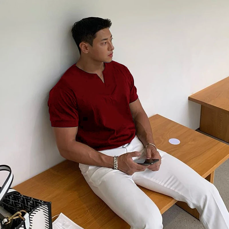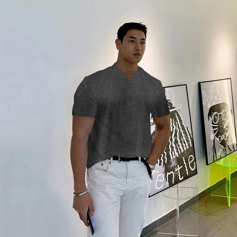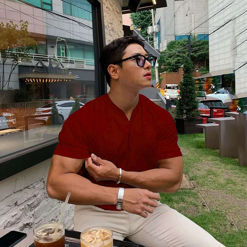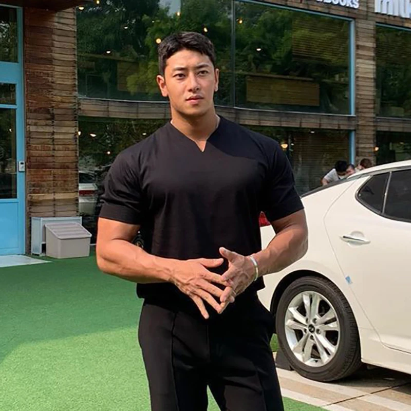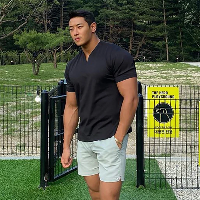 Мужская футболка с коротким рукавом Muscleguys, модная облегающая футболка с v-образным вырезом, Повседневная летняя спортивная футболка для фитнеса