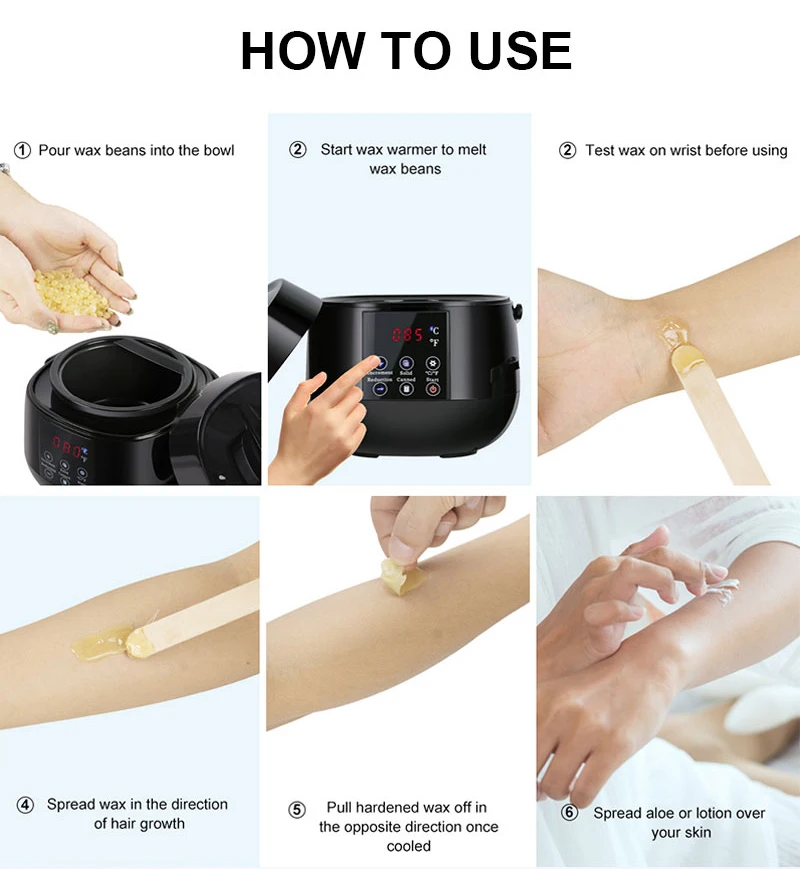 Перед использованием убедитесь, что кожа абсолютно чистая. Снимите крышку с нагреватель для воска. Отрегулируйте ручку на внутреннем горшке для удобства обращения. Положите в горшок соответствующее количество восковых бобов. Подключите его и включите питание, чтобы нагреть воск около 30 минут, убедитесь, что температура максимально повышена. Распределите палочкой слой воска следуя направлению роста волос, покрывая небольшие участки 15 - 18 квадратных сантиметров, которые вы хотите депиляцию, И толщина растекающегося воска должна быть от 0,2 до 0,5 см, чтобы обеспечить его результат использования. Оторвите его в обратном направлении, чтобы волосы быстро растули. После очистки Используйте увлажняющий крем без аромата для проведения массажа для более гладкой кожи. Пожалуйста, оплатите