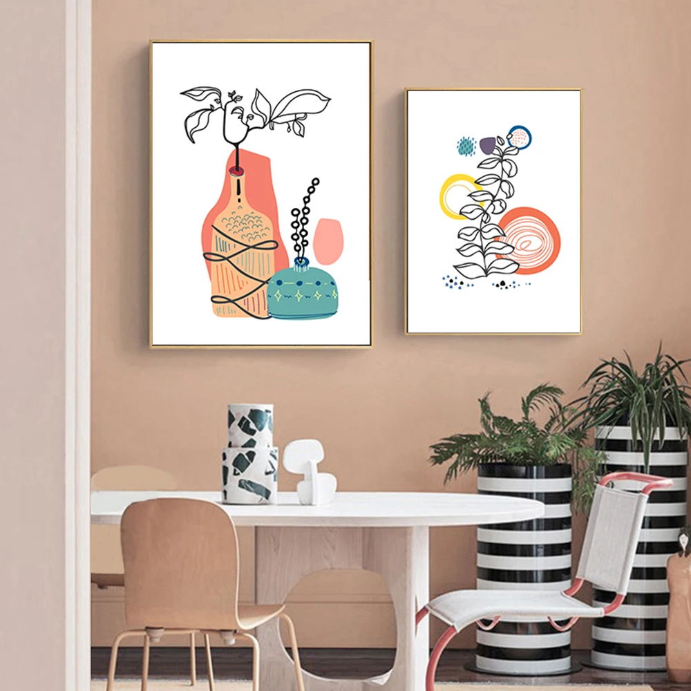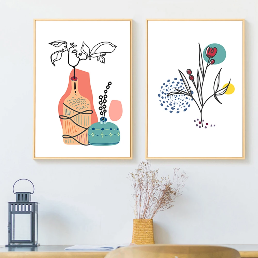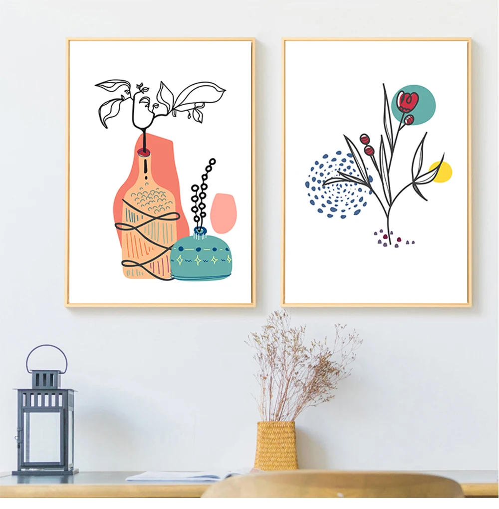 Абстрактная линия Цветочная ваза настенная Картина на холсте сканди...