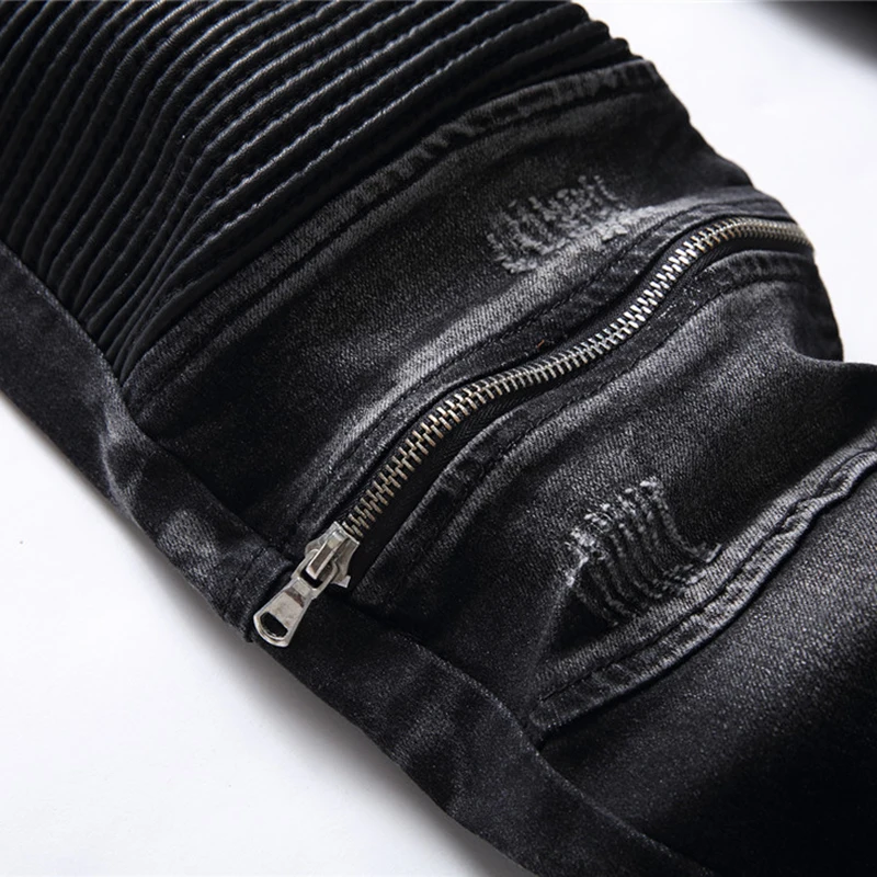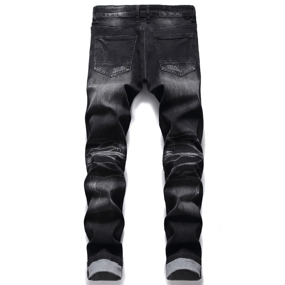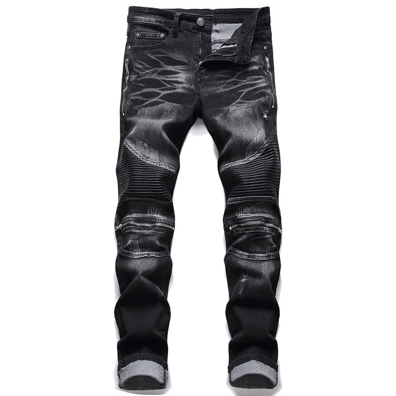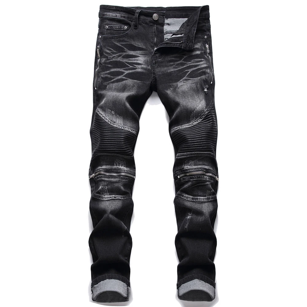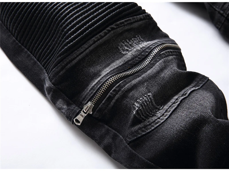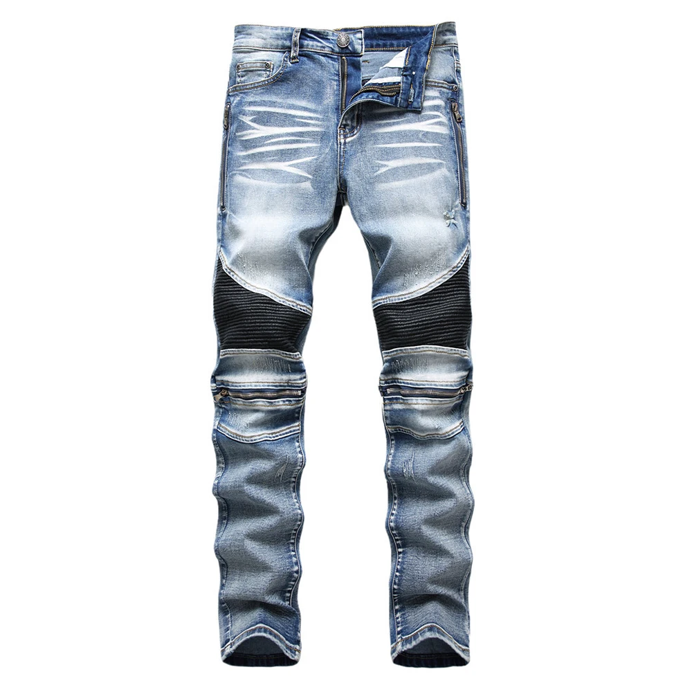 Мужские кожаные Лоскутные байкерские джинсы, уличная одежда на молнии, плиссированные Стрейчевые джинсовые штаны, рваные брюки