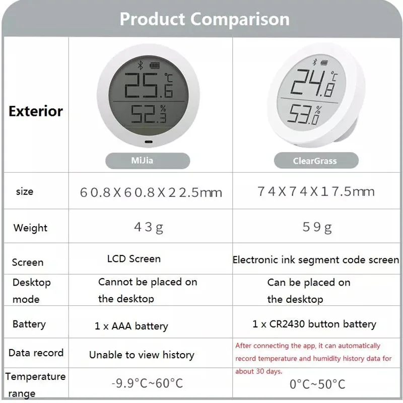 Характеристики:Название продукта: Bluetooth термометр и гигрометр ClearGrassМодель продукта: CGG1 M-версия датчика влажностиВес изделия: 59 граммРазмер экрана Диаметр: 55 ммДиапазон температур: 0 ~ 50 °CДиапазон влажности: 0 ~ 100% RHБеспроводная сеть Bluetooth 5,0Тип батареи: CR2430 кнопочный аккумулятор (в комплекте)Размер изделия: диаметр 74 мм, толщина 14 ммЦвет изделия: белый