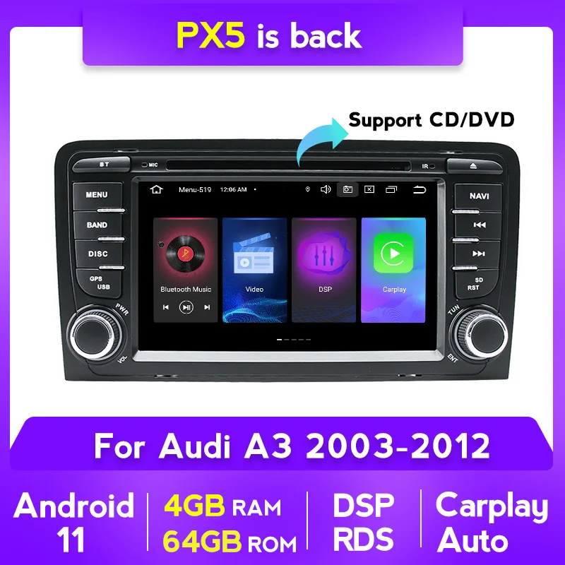 Автомобильный мультимедийный DVD-плеер PX5 DSP RDS Android 11 для Audi A3 8P 2003-2012 S3 2006-2012 RS3 2011 Авторадио CarPlay 4 Гб ОЗУ 64 Гб ПЗУ