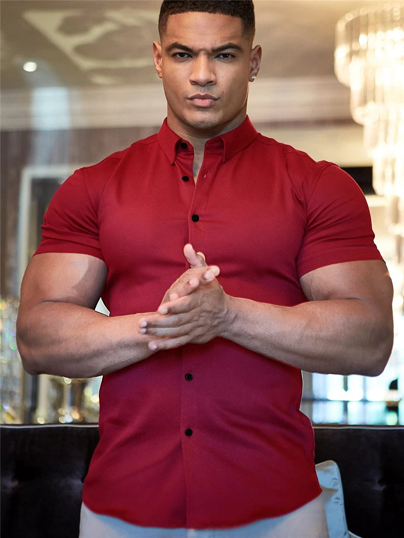 Модная мужская рубашка с коротким рукавом, однотонная, Супероблегаю...